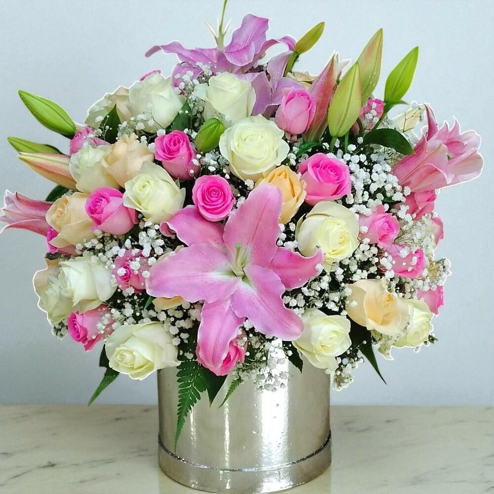 Descubra la perfecta armonía de elegancia y romanticismo con nuestro arreglo de 5 lirios rosados y 30 rosas rosadas, 20 rosas melocotón, 20 rosas blancas complementadas por 8 rellenos verdes de paniculata. Presentado en una elegante caja plateada, este conjunto irradia sofisticación y sentimiento sincero, lo que lo convierte en un regalo ideal para expresar amor y admiración.