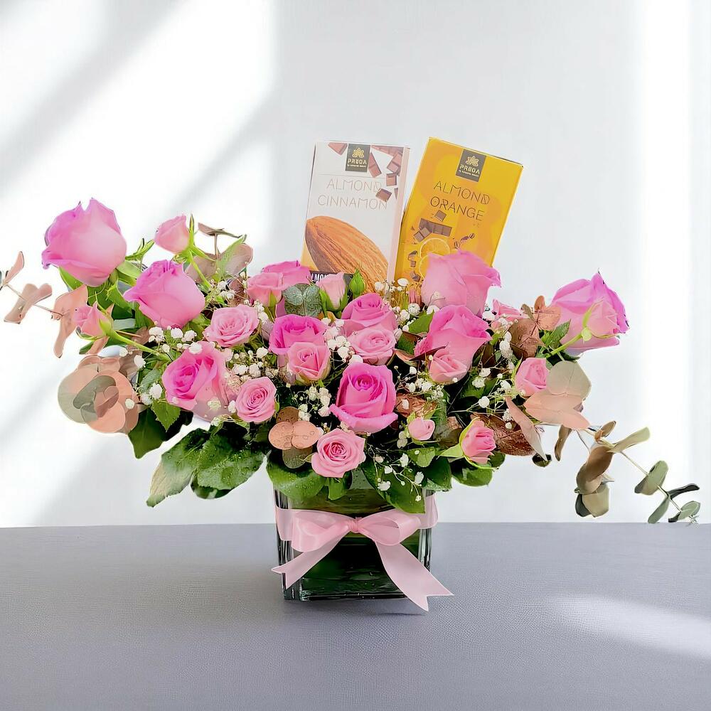 Contemple una exquisita selección de especiales de floristería. Esta delicia floral combina 10 etéreas rosas rosas, realzadas por 3 rosas en spray del mismo tono. Envueltas en este abrazo floral, descubrirá dos barras de 200 g de delicioso chocolate Preda: una delicia gourmet en un jardín de sorpresas. Para equilibrar esta fragante sinfonía, se encuentran los toques de 3 gypsophilas y 6 ramitas de eucalipto, cuya aura especiada se funde a la perfección con el suave perfume de las rosas frescas. Este atractivo arreglo se presenta cómodamente en un único jarrón transparente de alta calidad, que le aporta un toque minimalista a la vez que deja que la belleza floral resalte. Una combinación perfecta de flores y exquisitez: un deleite para la vista y el paladar.