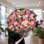 Haz una declaración espectacular con este exuberante ramo de lujo. Con 31 rosas de un vibrante color rosa y 15 delicadas rosas spray color melocotón, este arreglo ofrece un volumen y una textura increíbles. Acentuado con eucalipto fresco y un elegante envoltorio escarchado, es el regalo perfecto para aniversarios o cumpleaños. Atado a mano y diseñado para impresionar con su suave y romántica paleta.