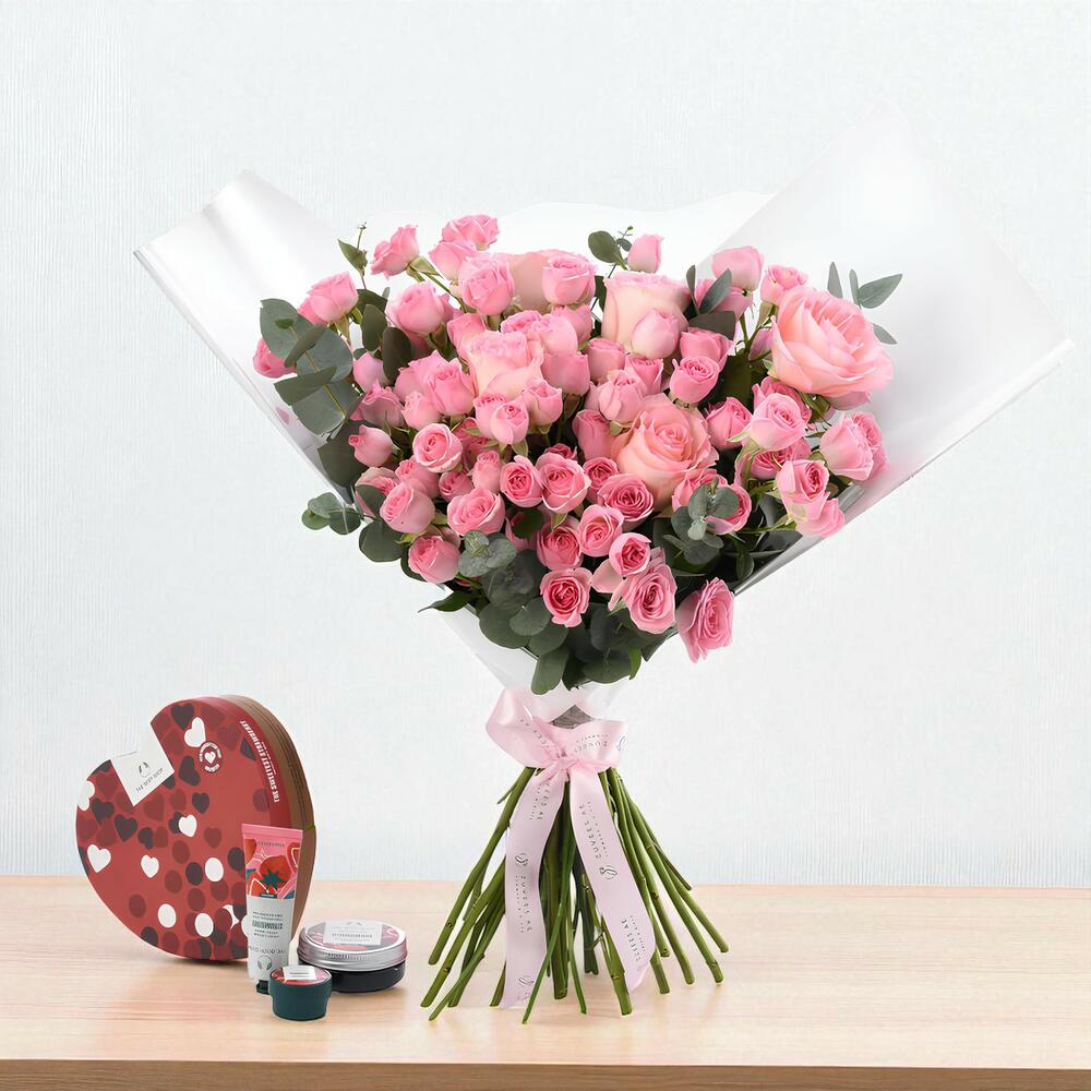 eucalyptus sprig - 5 ud. tallos de ruscus - 7 ud. pink roses - 5 ud. pink spray roses - 20 ud. caja de regalo de the body shop - 1 ud.