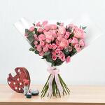 Celebra la elegancia y la dulzura con el combo de caja de regalo Pink Perfection Bouquet Strawberry. Este elegante arreglo incluye una selección de flores rosas suaves, cuidadosamente envueltas en dos capas de papel blanco nítido y terminadas con un listón rosa satinado. Combinado con la caja de regalo "Sweetest Strawberry Heart" de The Body Shop (crema de manos, manteca corporal y bálsamo labial), este combo es una encantadora expresión de amor, aprecio o celebración, ideal para las mujeres especiales de tu vida.