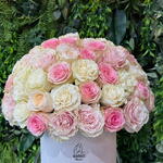 A refined dome of pink and ivory roses in a signature luxury round box.