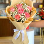 Bouquet of 6 pink roses with fillers in a nice wrapping. Delicate bouquet of 6 pink roses with soft fillers, elegantly wrapped for a charming and graceful presentation. Perfect for expressing love, appreciation, or warm wishes on any occasion. 6 pink rose bouquet, fresh rose arrangement, romantic floral gift, elegant flower delivery. Trim stems and place in clean water, keeping the bouquet away from direct sunlight and heat. Change water daily and remove wilted petals to maintain freshness.