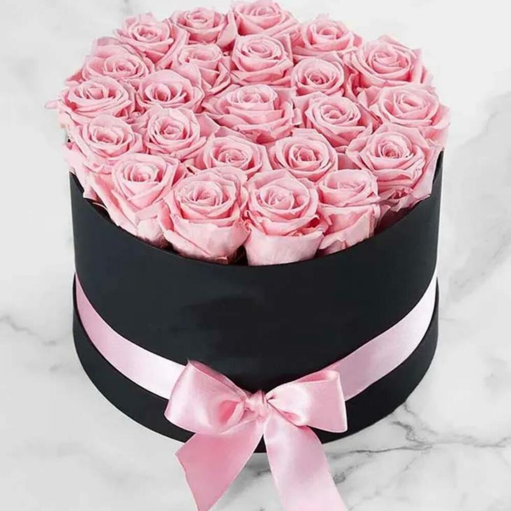 Rosas rosadas en caja redonda negra