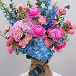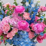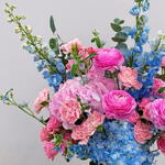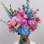 Una impresionante exhibición de vibrantes ranúnculos fucsia y alegres claveles rosa, contrastando maravillosamente con deslumbrantes delphinium azul bebé y hortensias. Perfecta para una inauguración del hogar, como regalo de felicitación o para hacer una audaz declaración de cumpleaños. 🦋🩷