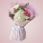2 hortensias blancas, 1 hortensia rosa, 5 rosas spray rosadas, 3 eucaliptos