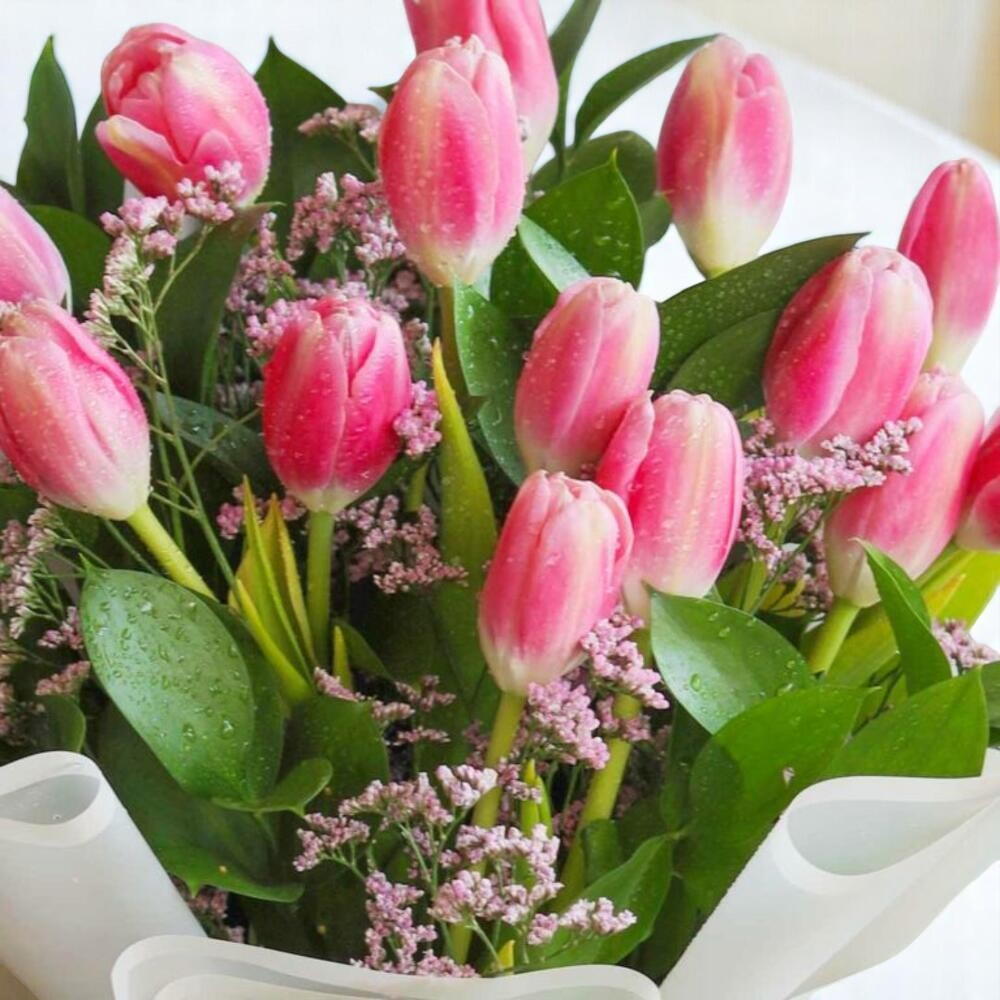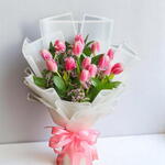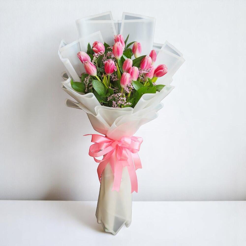 Ilumina cualquier ocasión con este impresionante ramo de 15 tulipanes rosas, perfectamente arreglado con hojas verdes frescas y flores de relleno delicadas. Envuelto en papel esmerilado de primera calidad y atado con una suave cinta de raso rosa, este elegante ramo es ideal para cumpleaños, aniversarios, gestos románticos o simplemente porque sí. Instrucciones de cuidado: Recorta los tallos de los tulipanes en diagonal antes de colocarlos en un jarrón limpio con agua fría. Mantén el ramo en un lugar fresco, lejos de la luz solar directa y de fuentes de calor. Renueva el agua a diario para mantener la frescura y retira las hojas marchitas para una belleza de mayor duración.