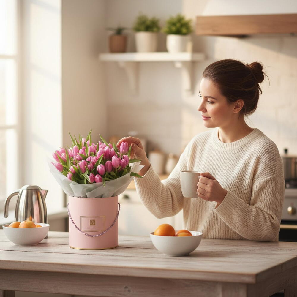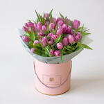 Un lujoso arreglo de 51 delicados tulipanes rosas, hermosamente presentado en una caja elegante. Simbolizando admiración, gracia y encanto, esta impresionante presentación es perfecta para cualquier ocasión emotiva. 35×40