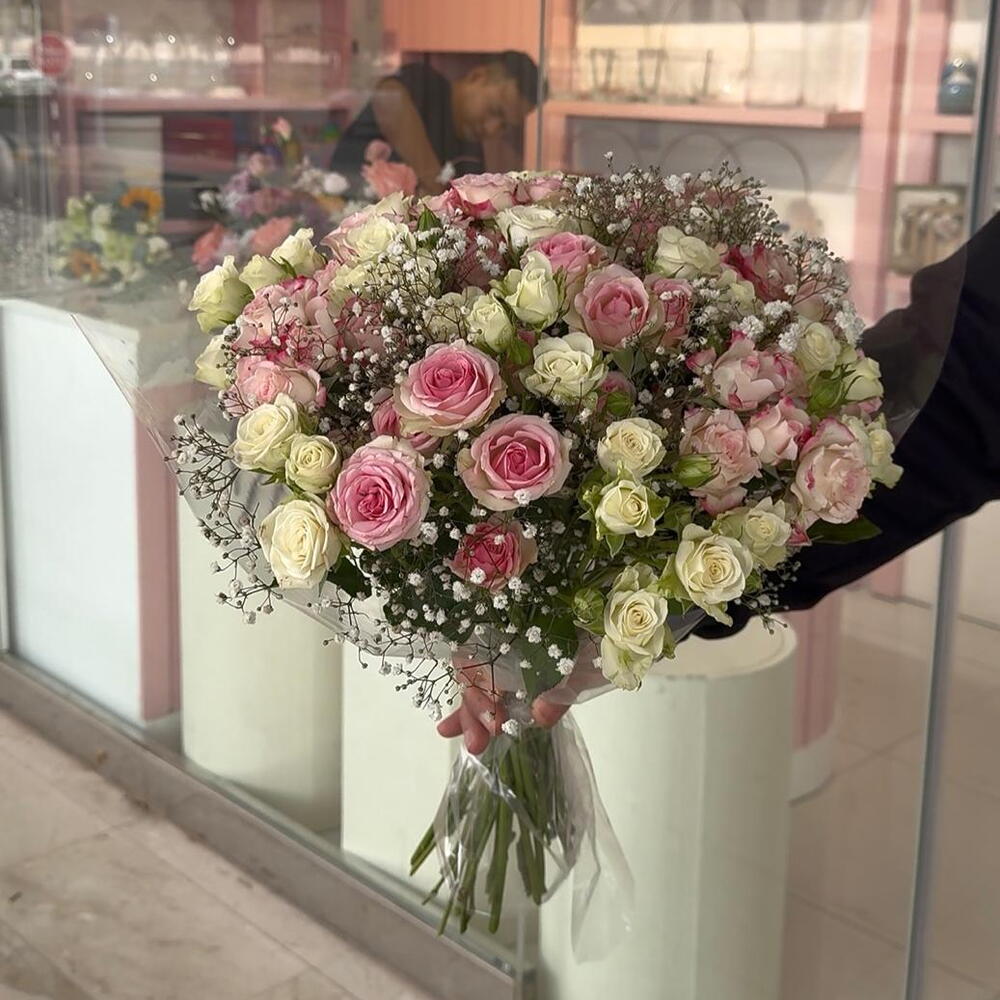 Sorprende a alguien especial con este impresionante arreglo a elección del florista. Presenta una encantadora combinación de 5 delicados tallos de gypsophila que aportan un contraste tipo nube al estallido de color proporcionado por 20 exquisitas rosas spray. Elaborado por manos expertas, ¡este ramo es perfecto para cualquier ocasión!