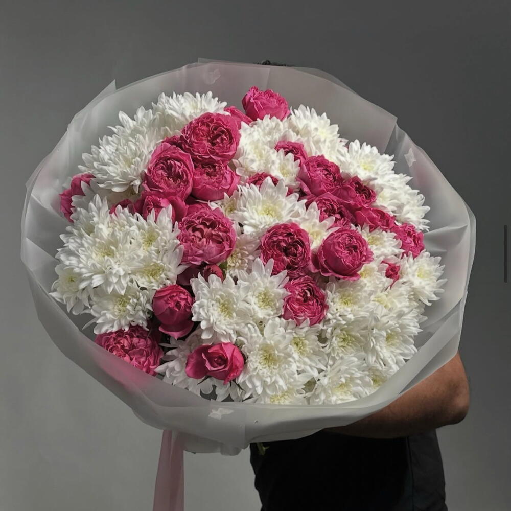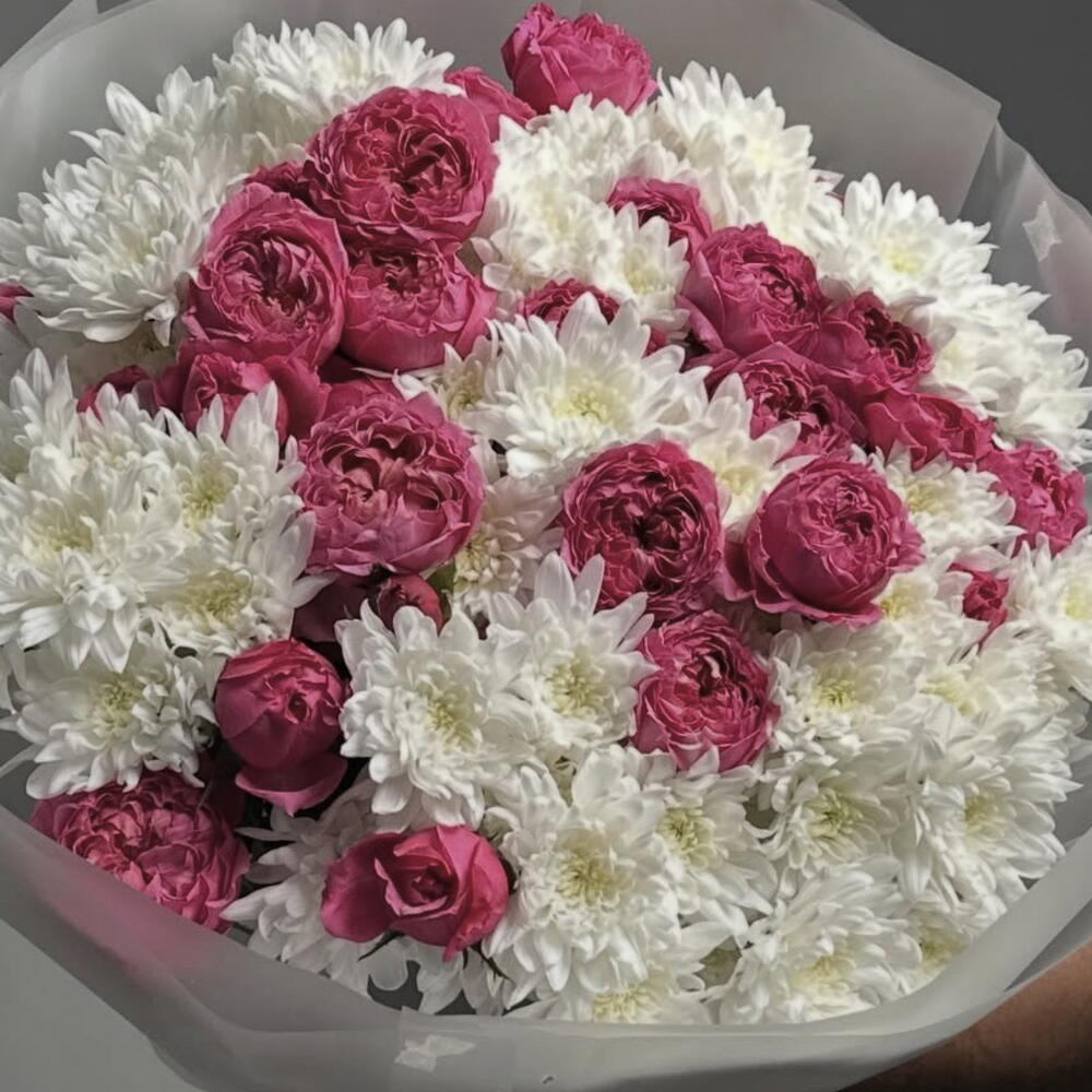 Este elegante ramo redondo de gran tamaño es un equilibrio perfecto entre la pasión audaz y la suavidad pura. Presenta una mezcla exuberante y densamente compacta de: • Rosas de jardín vibrantes en fucsia y rosa intenso que aportan energía y romanticismo • Crisantemos (mums) de un blanco nieve nítido que aportan luminosidad y un delicado contraste Las flores están artísticamente dispuestas en una gran y plena forma de cúpula, creando una llamativa armonía visual entre los ricos tonos rosados y las flores de un blanco puro. Unas pocas hojas verdes asoman sutilmente para aportar frescura, mientras que todo el ramo está envuelto en un suave papel blanco translúcido y rematado con una delicada cinta rosa pálido.
