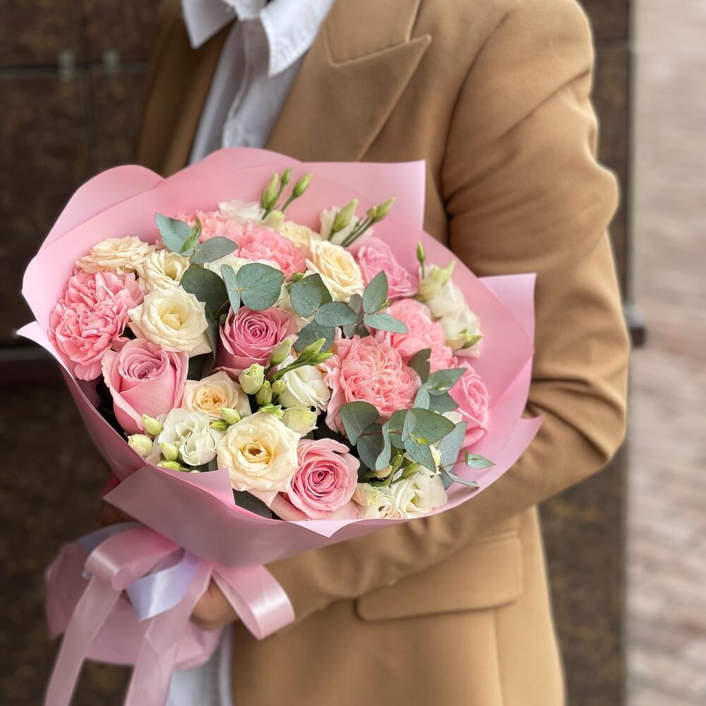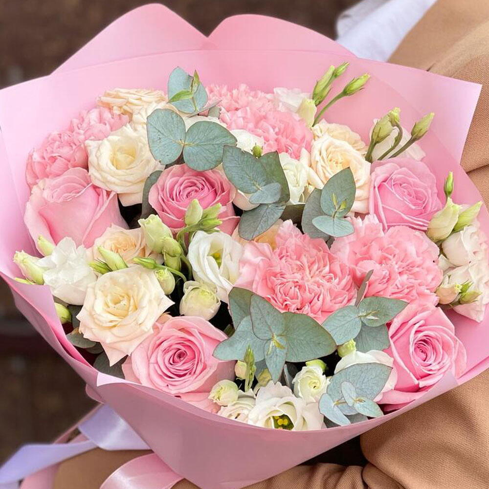 La cinta - 1 ud. White rose - 5 ud. Wrapping - 3 ud. claveles rosas - 3 ud. eucalyptus leaves - 2 ud. rosa rosada - - 5 ud. lisianthus blanco - - 5 ud.