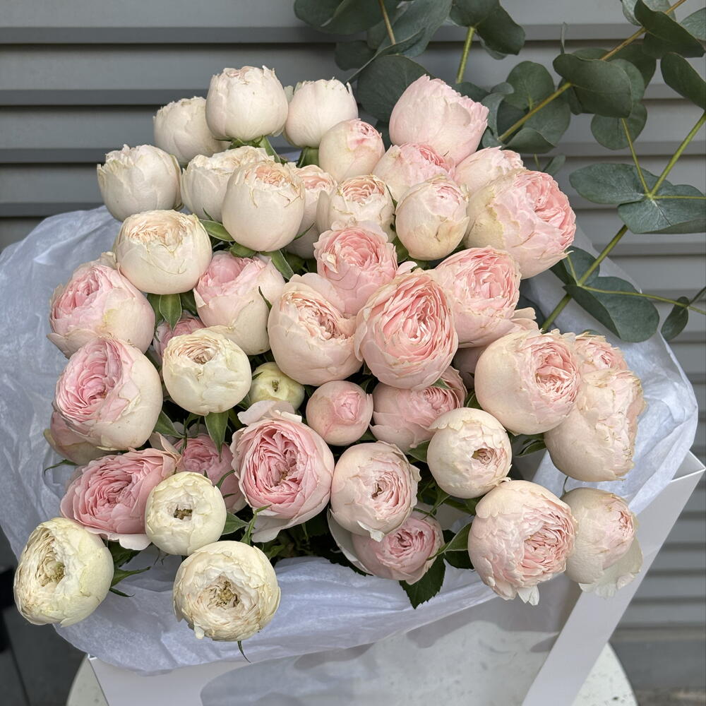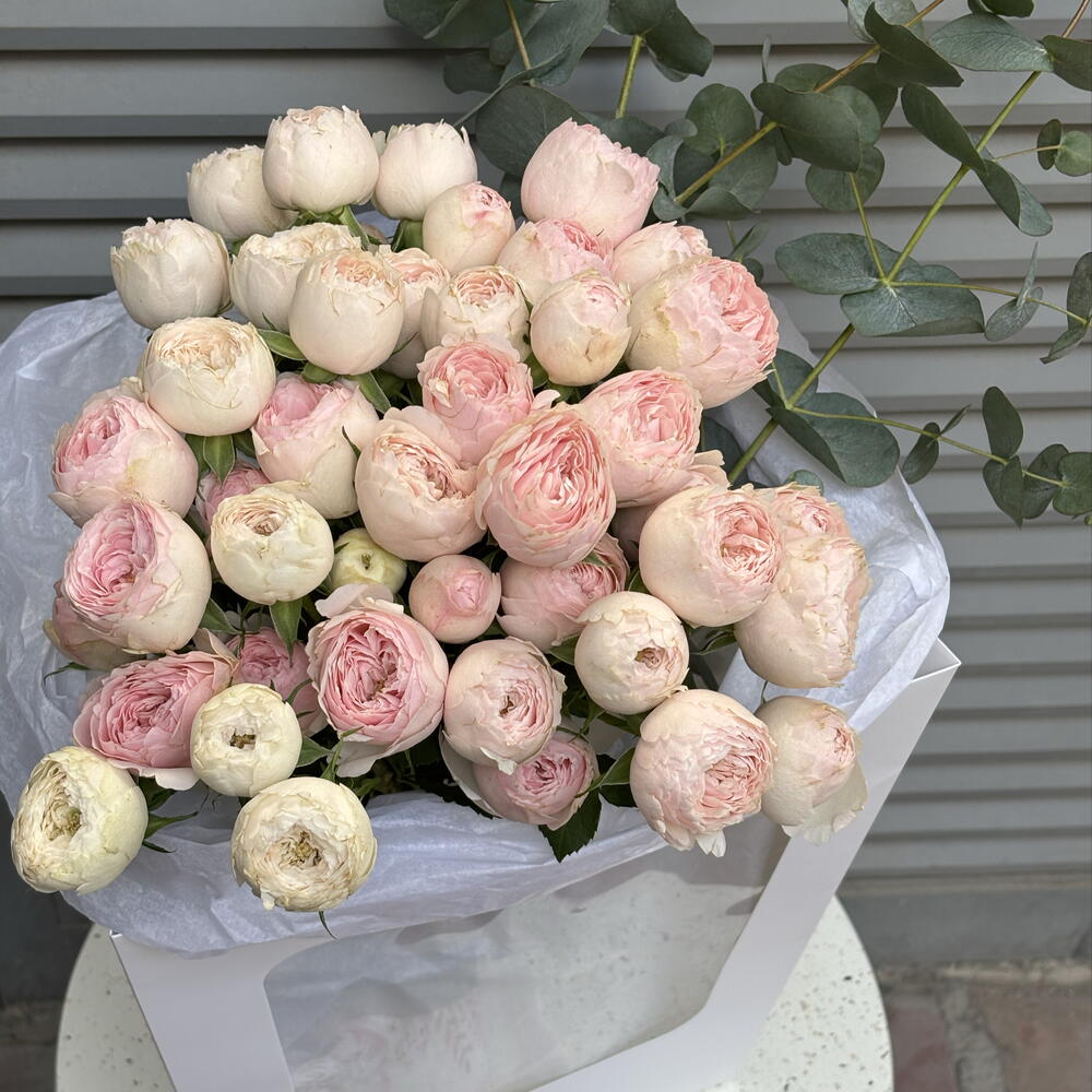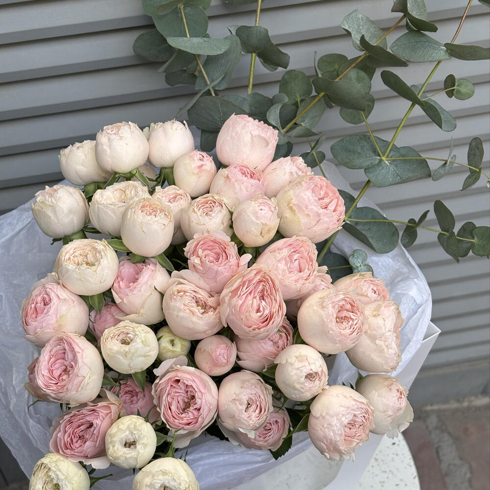 Lovely piony roses and eucaliptus iconic and elegant bouquet