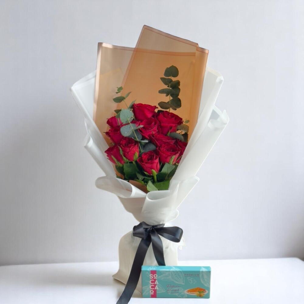 Una exquisita combinación del viral Pistachio Kunafa Milk Chocolate de Dubái y un ramo de 11 rosas rojas frescas. Déjate llevar por el rico sabor a frutos secos del chocolate premium combinado con la delicada belleza de las rosas—un regalo perfecto para expresar amor, lujo y momentos inolvidables.