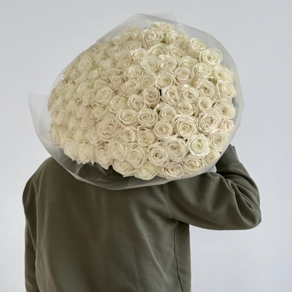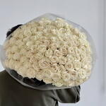 El ramo está compuesto por rosas de la variedad Playa Blanca. Las flores tienen un capullo interesante, alargado y denso. Crean una exquisita paleta de tonos, desde el blanco brillante hasta el color crema. Estas rosas son de alta calidad y de larga duración, lo que las convierte en la elección perfecta para crear un ramo hermoso y espectacular. La fragancia del ramo llena el espacio de calidez y confort, creando una atmósfera de romanticismo y admiración. Le da al ramo un encanto y atractivo únicos.