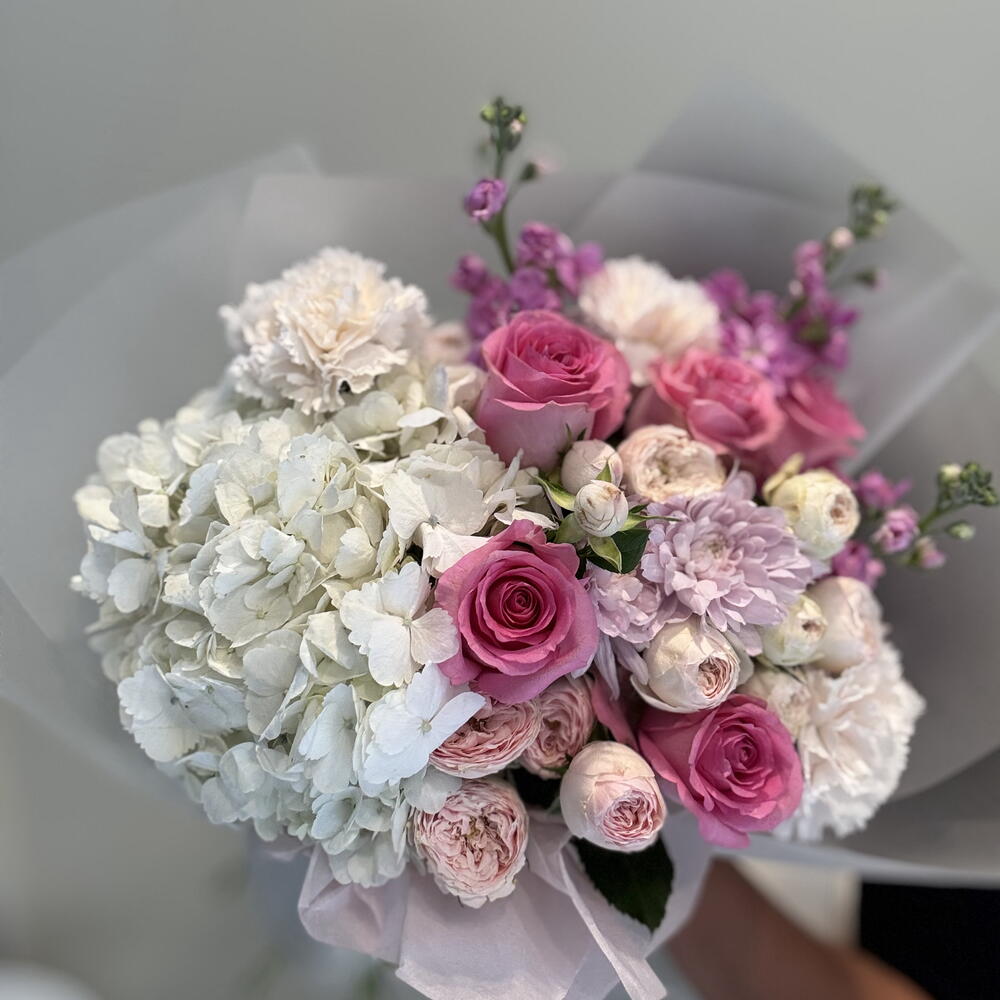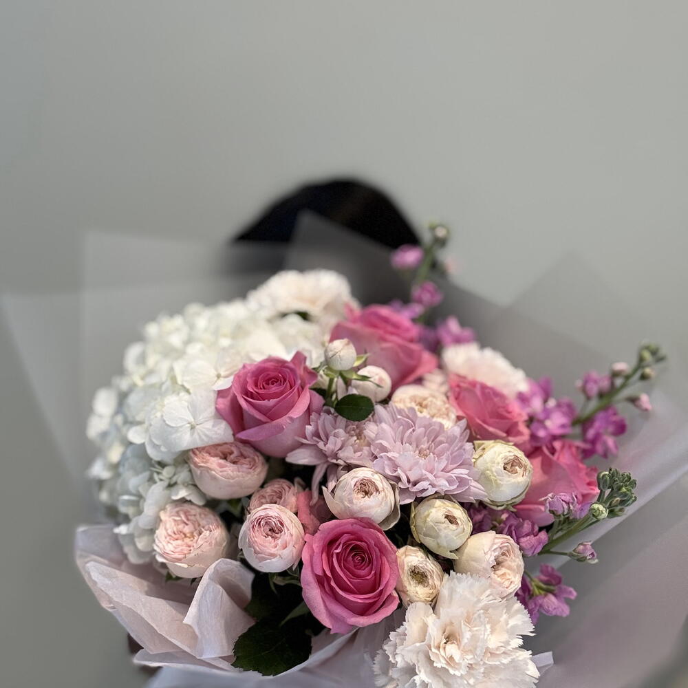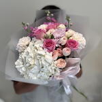 Pink rose - 5 ud. carnation pink - 3 ud. hydrangea white - 1 ud. mansfield park - 3 ud. crisantemo - 1 ud. matthiola pink - 3 ud.