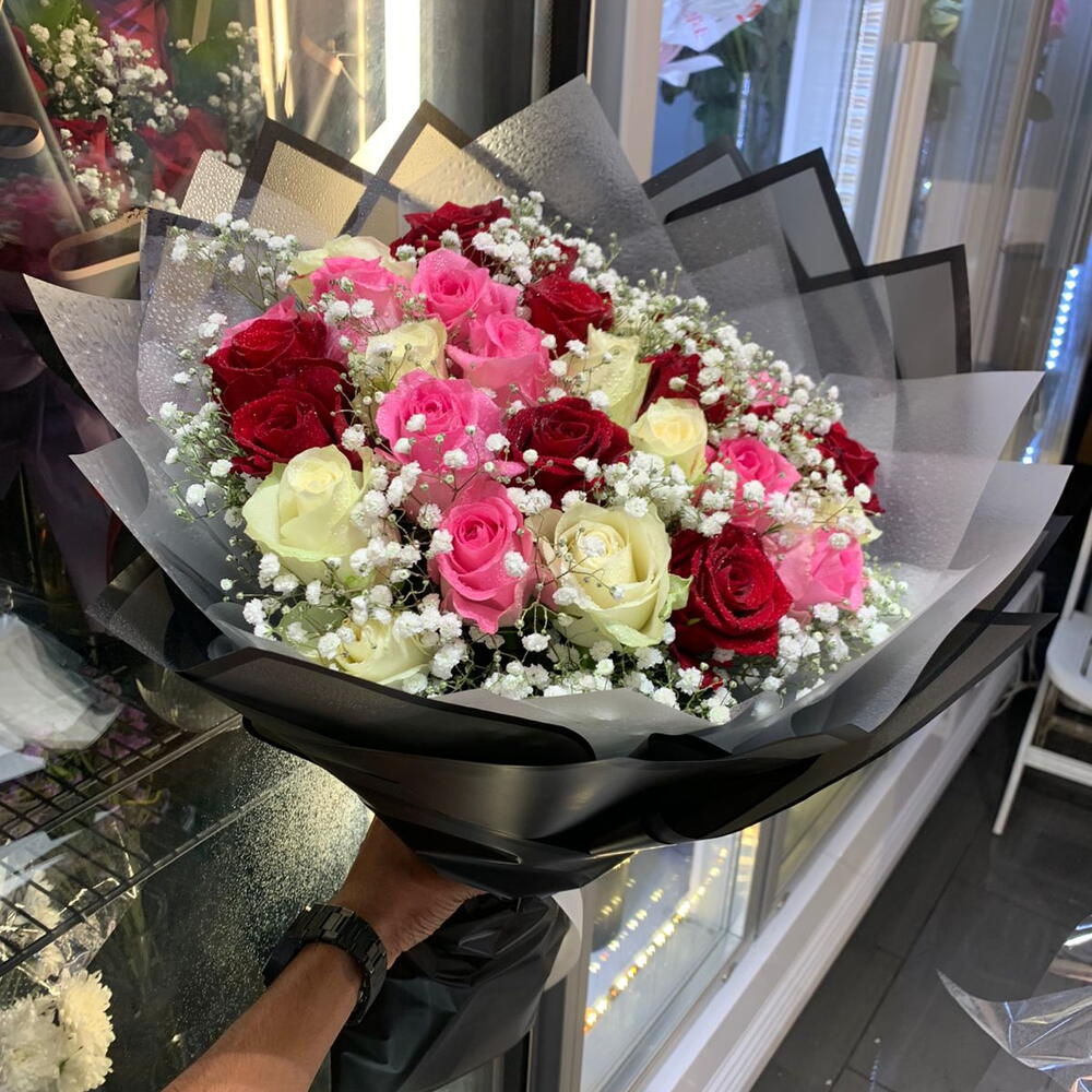 Red rose - 10 ud. Pink rose - 10 ud. White rose - 10 ud. yeso - 5 ud.