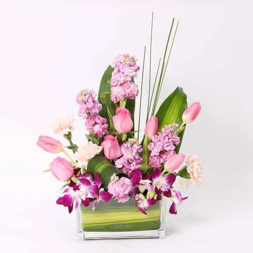 Bombones Patchi Deluxe de 250 g 3 Rosas Rosas 4 Tulipanes Rosas 5 Matthiolas Rosas 3 Claveles Rosas 2 Orquídeas Moradas Hojas: 4 hojas de Massangeana y Hierba Seca Preparado en un jarrón rectangular con una etiqueta del Día de la Mujer
