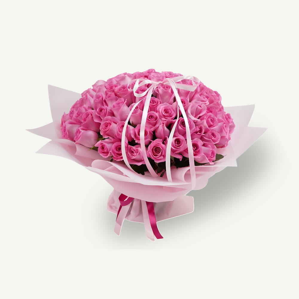Un ramo atado a mano de 101 rosas de color rosa, elegantemente envuelto en papel rosa suave para un toque delicado y romántico.