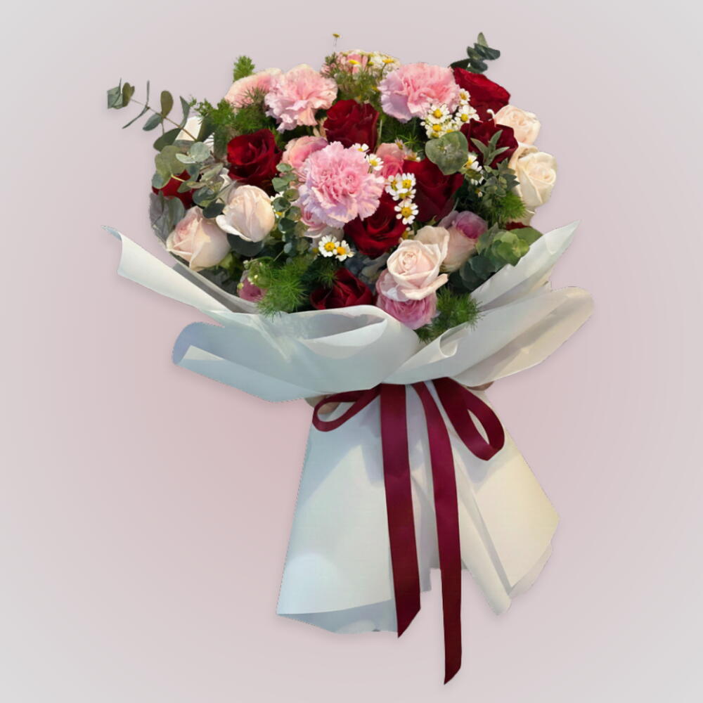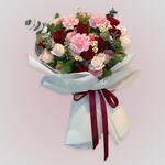 5 rosas rojas, 5 claveles rosas, 3 rosas baby rosadas