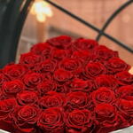 Una cama densa y uniforme de aproximadamente 30 a 35 rosas de rojo intenso. Las flores están meticulosamente niveladas para crear una superficie aterciopelada y continua que resalta la riqueza natural de los pétalos rojos.