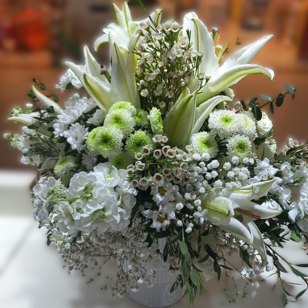 Un radiante arreglo completamente blanco en un jarrón, con elegantes lirios, alegres gerberas, santinis delicados y rosas clásicas. Acentuado con accesorios de buen gusto, este ramo encarna pureza, serenidad y belleza atemporal — perfecto para bodas, celebraciones o gestos sinceros de paz y amor.