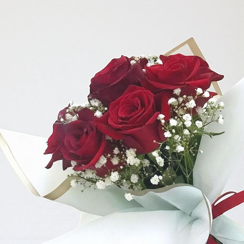 Un ramo impresionante de exuberantes rosas rojas combinadas con delicada gypsophila, envuelto en un sofisticado envoltorio blanco con un toque de ribete dorado. Este arreglo es una expresión perfecta de amor, admiración y elegancia, lo que lo hace ideal para aniversarios, propuestas, cumpleaños o cualquier ocasión emotiva. Recorta los tallos en diagonal antes de colocarlos en agua fresca. Cambia el agua cada 2 días y mantén el ramo alejado de la luz solar directa y de fuentes de calor. Este ramo está diseñado para mantenerse fresco y vibrante, ofreciendo belleza y amor duraderos! ❤️