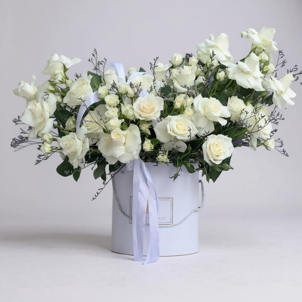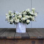 Eucalyptus - 2 ud. relleno - 3 ud. caja redonda blanca - 1 ud. rosas blancas - 21 ud. rosas spray blancas - 6 ud.