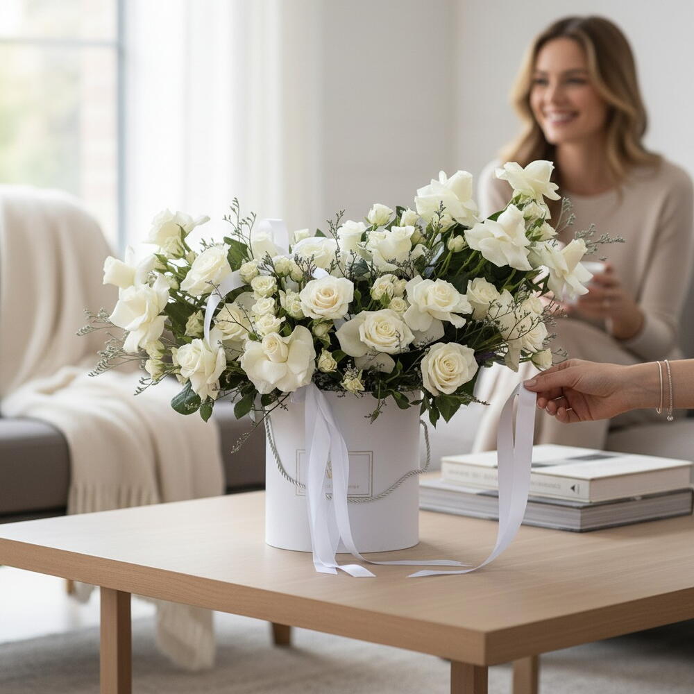 Un exquisito arreglo en caja de 21 rosas blancas inmaculadas y 6 delicadas rosas spray blancas, simbolizando la pureza, la gracia y la elegancia atemporal. Rematado con una cinta suave y elegante, este sereno ramo es una expresión perfecta de sentimientos sinceros, ideal tanto para ocasiones románticas como elegantes.Mantén tus flores frescas y vibrantes cortando los tallos en ángulo, cambiando el agua diariamente y colocándolas en un lugar fresco, alejado de la luz solar directa y de las corrientes de aire 40x35