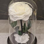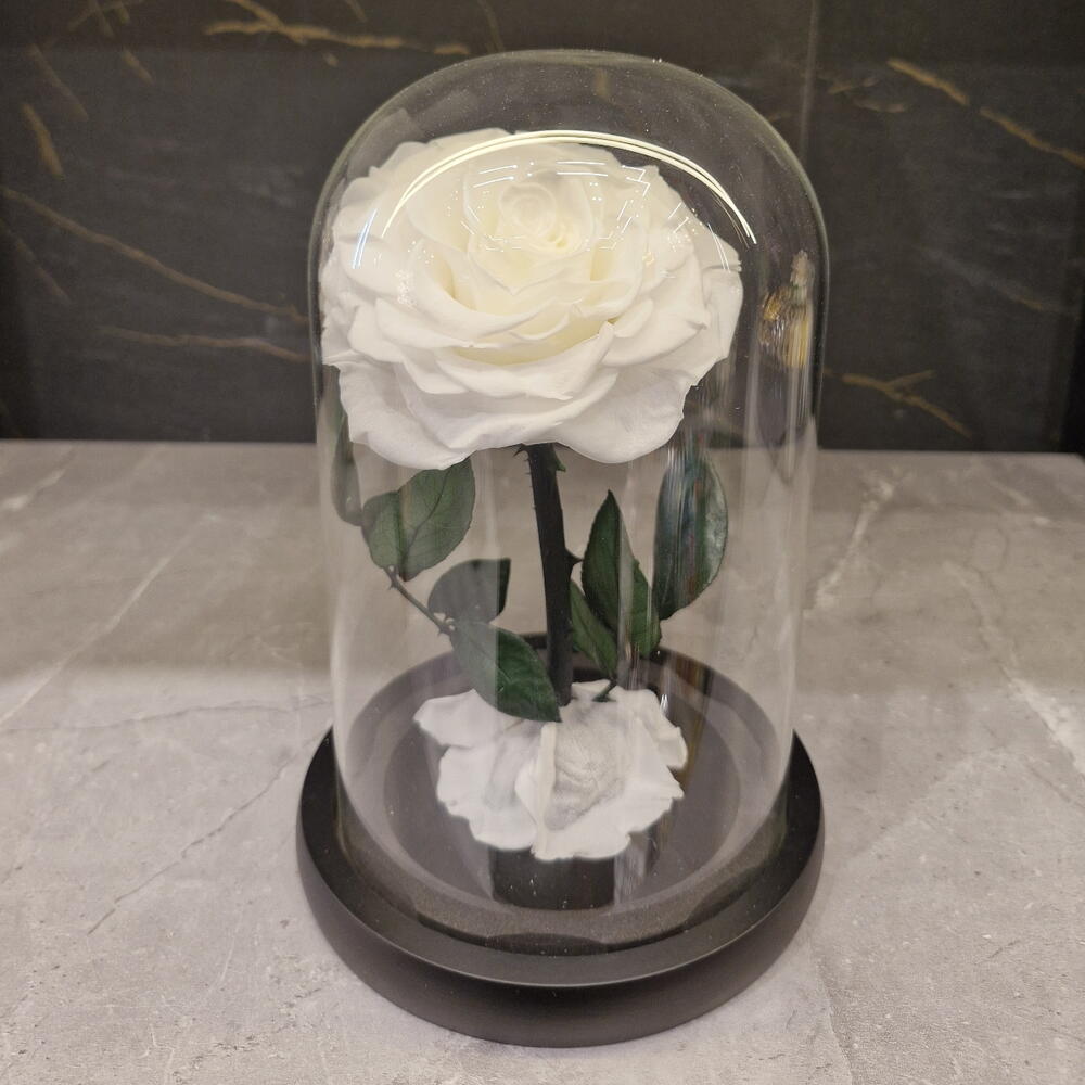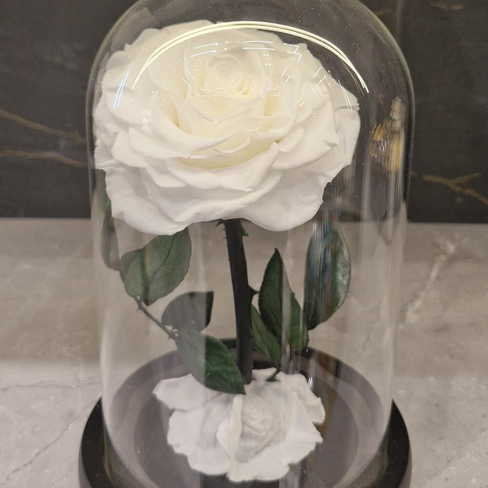 cúpula de cristal con base de madera negra - 1 ud. rosa blanca preservada - 1 ud.