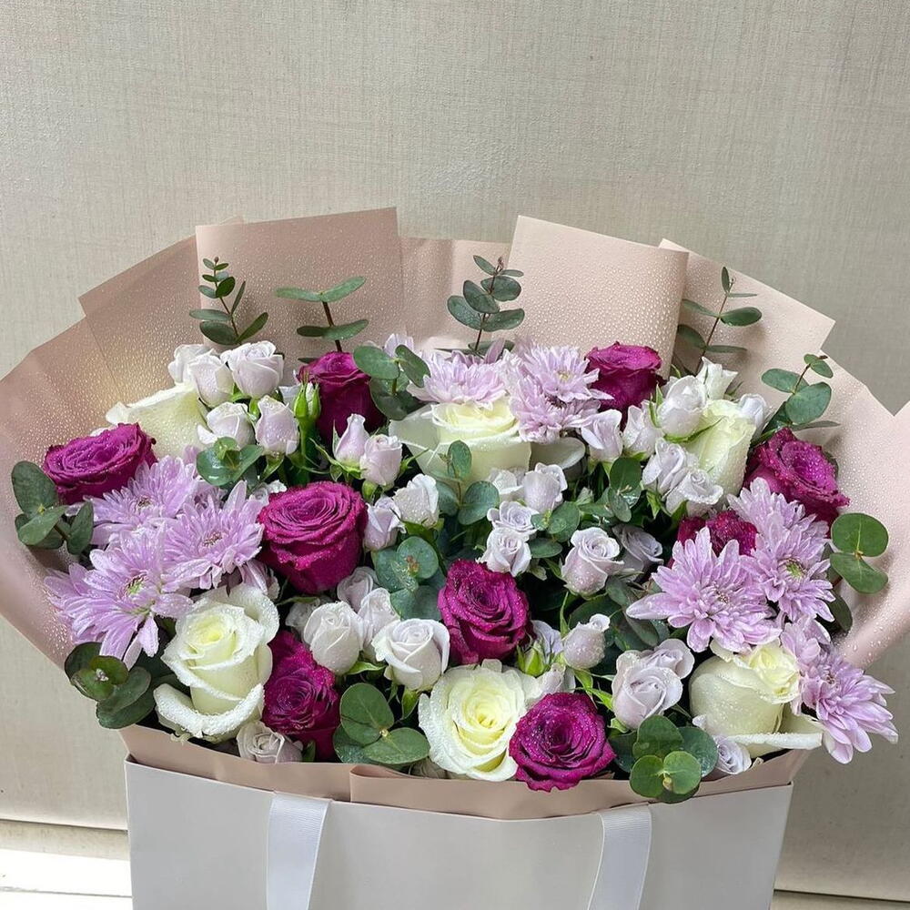 crisantemo morado - 3 ud. eucalipto. - 5 ud. rosa púrpura oscura - 9 ud. rosa blanca. - 6 ud. rosa morada pequeña - 6 ud.
