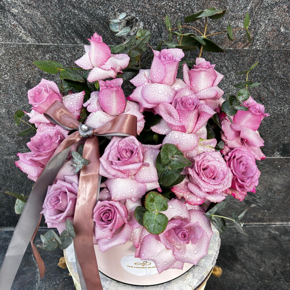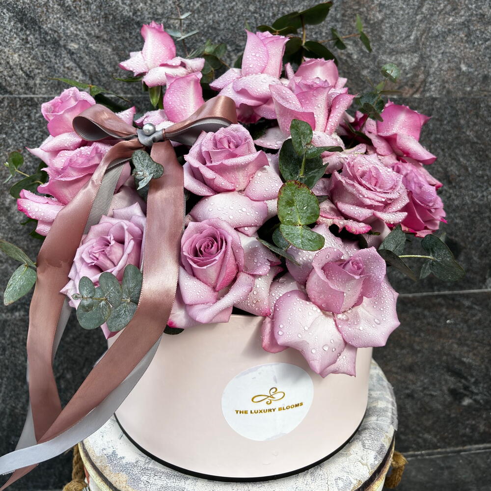Hermosa composición de rosas moradas con hojas de eucalipto en una gran caja sombrerera con cinta de satén