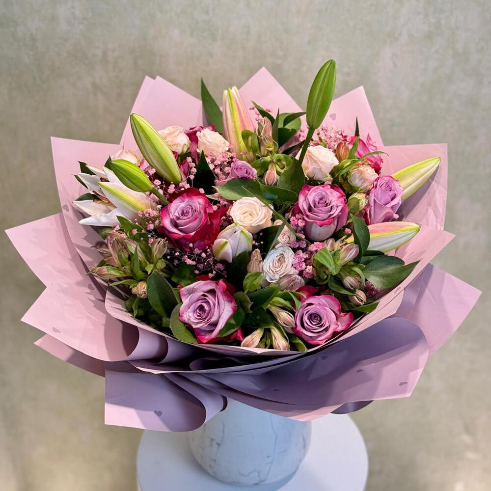 La cinta - 1 ud. Lily - 3 ud. Gypsophila - 5 ud. purple rose - 8 ud. rosa bebé melocotón - 4 ud. astroemeria - 5 ud. envoltorio morado - 5 ud.