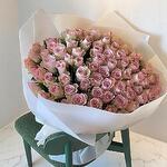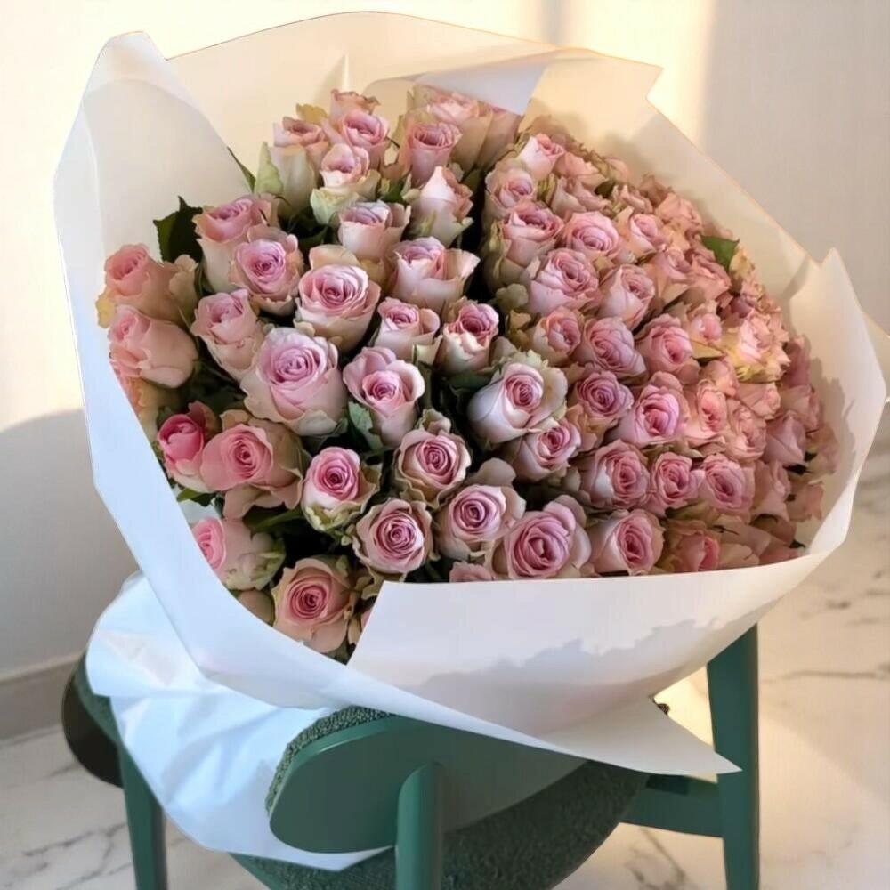 Ramo Purple Stars con 70 rosas lila claro – Elegante arreglo de rosas lavanda en envoltorio blanco