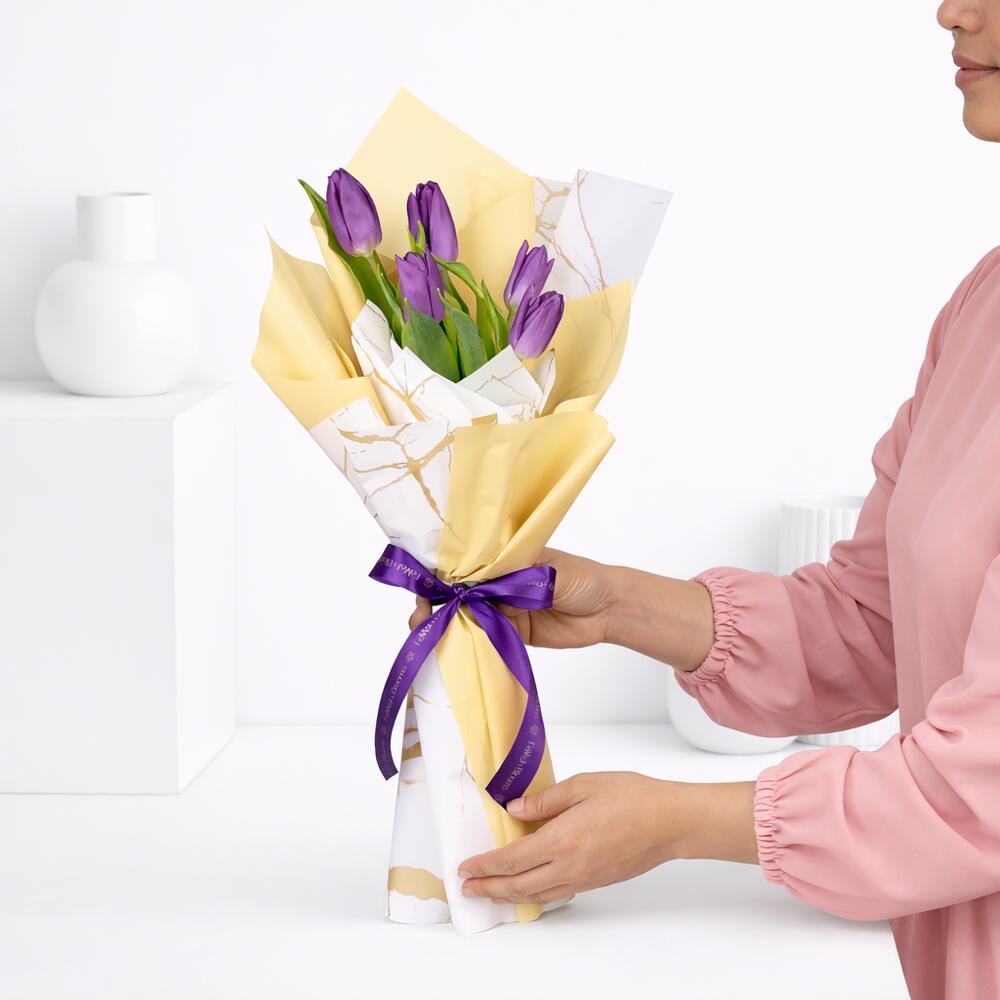 A charming bouquet of Fresh 5 Purple Tulips, beautifully arranged to create a simple yet elegant floral gift. Wrapped in soft yellow and white marble-style wrapping with subtle gold accents, the bouquet offers a stylish and modern presentation. Finished with a premium purple satin ribbon, it adds a touch of luxury and sophistication. Perfect for birthdays, congratulations, thank-you gifts, or special moments, this bouquet brings freshness, color, and elegance to any occasion. A beautiful floral arrangement that symbolizes admiration, elegance, and heartfelt appreciation.