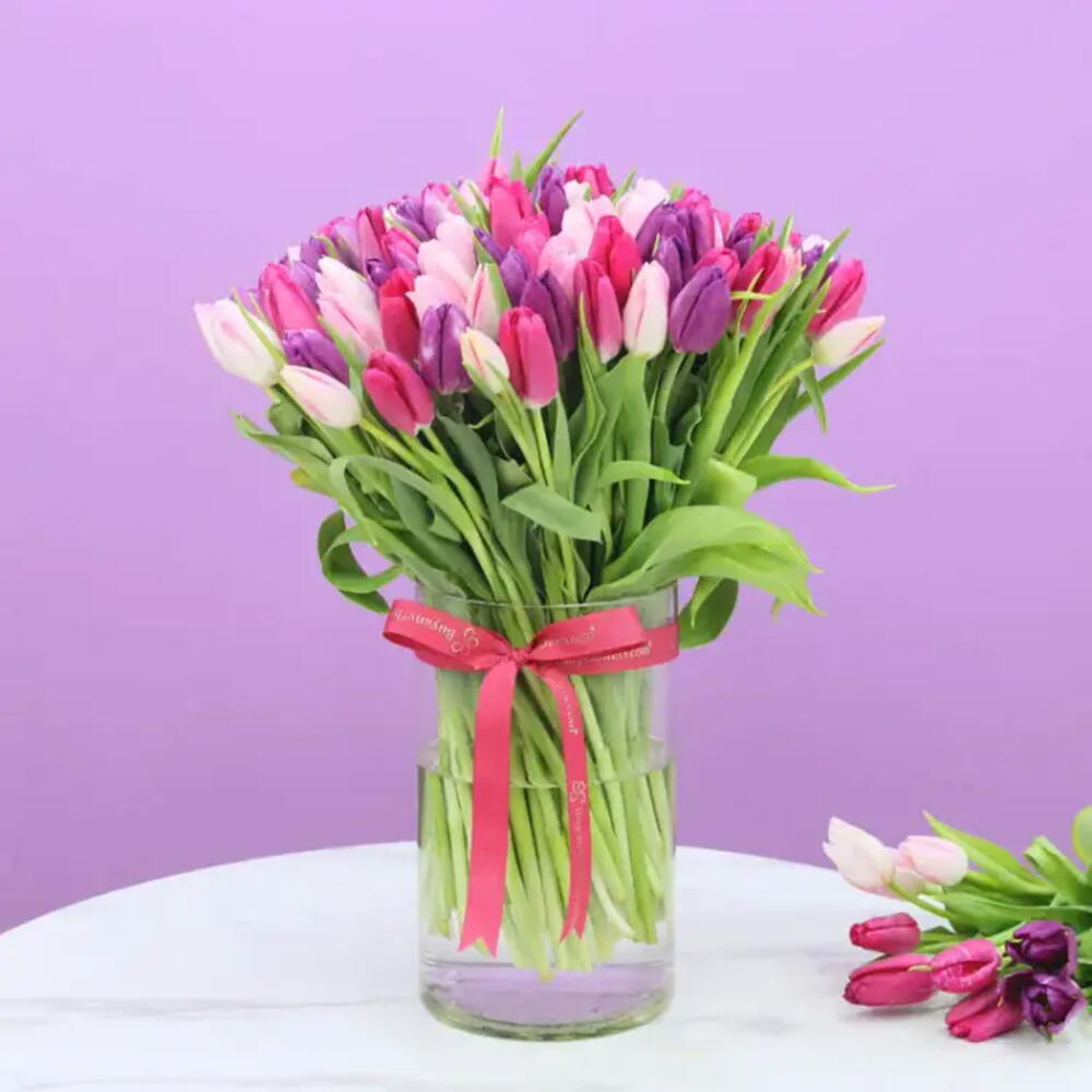 Descripción del producto 36 tulipanes morados 35 tulipanes rosa oscuro 35 tulipanes rosas Arreglados en jarrón cilíndrico de vidrio - 15_25cm Atado con lazo rosa oscuro