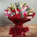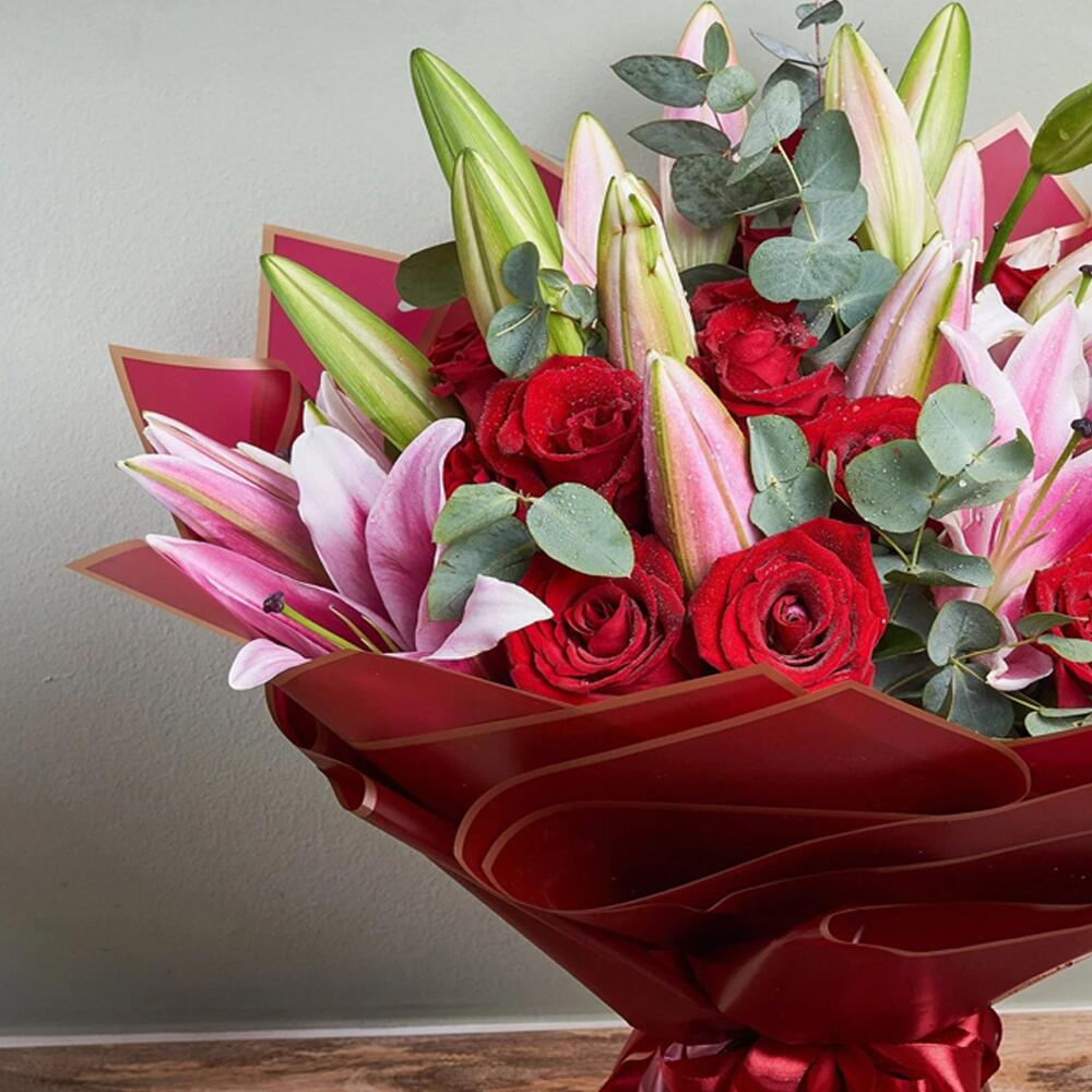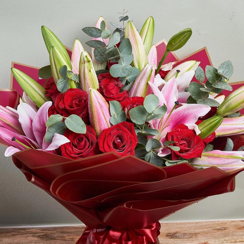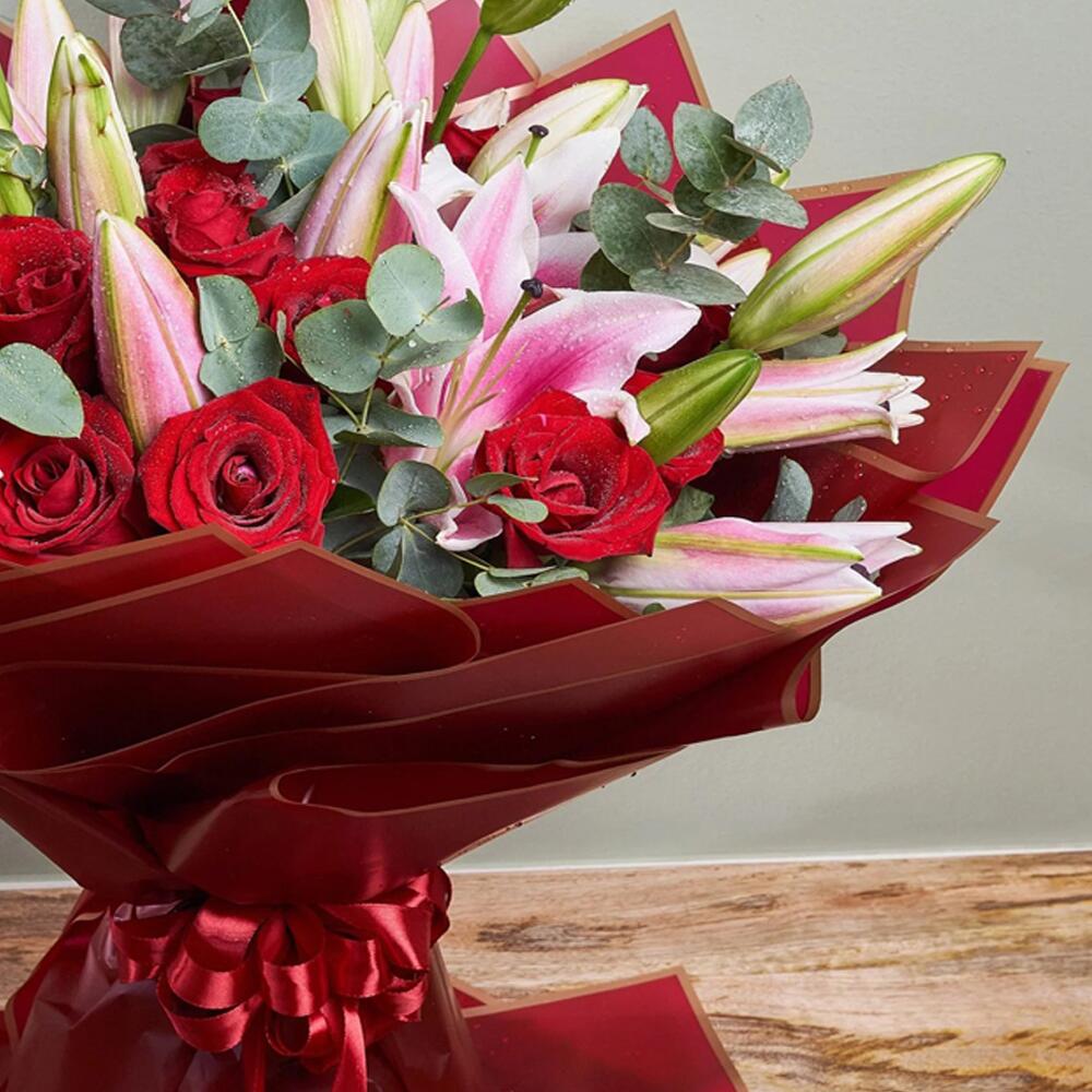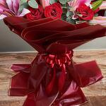 Sumérgete en el esplendor de este exquisito mono bouquet. Compuesto por cuatro imponentes lirios y veinte rosas rojas aterciopeladas, dispuestos con esmero entre cinco ramitas de fragante eucalipto. Todo delicadamente envuelto en cinco capas de papel rojo y atado con una sola cinta. Este lujoso arreglo floral está diseñado para encantar cualquier espacio, dejando una impresión duradera de elegancia y sofisticación. Perfecto para cualquier ocasión o simplemente porque sí.