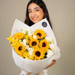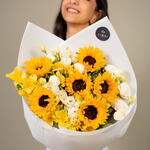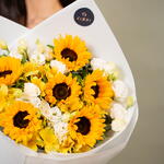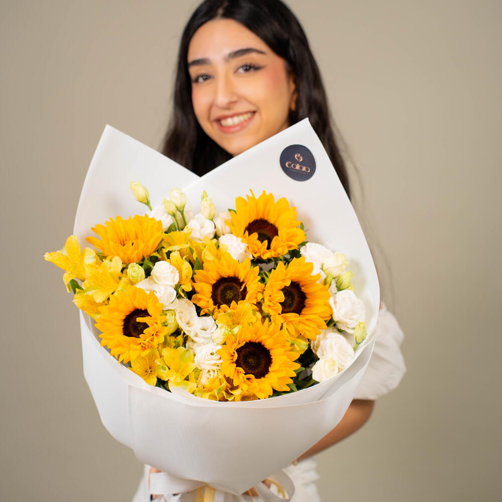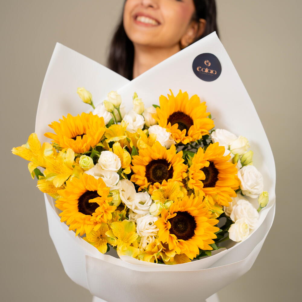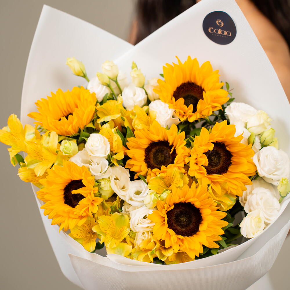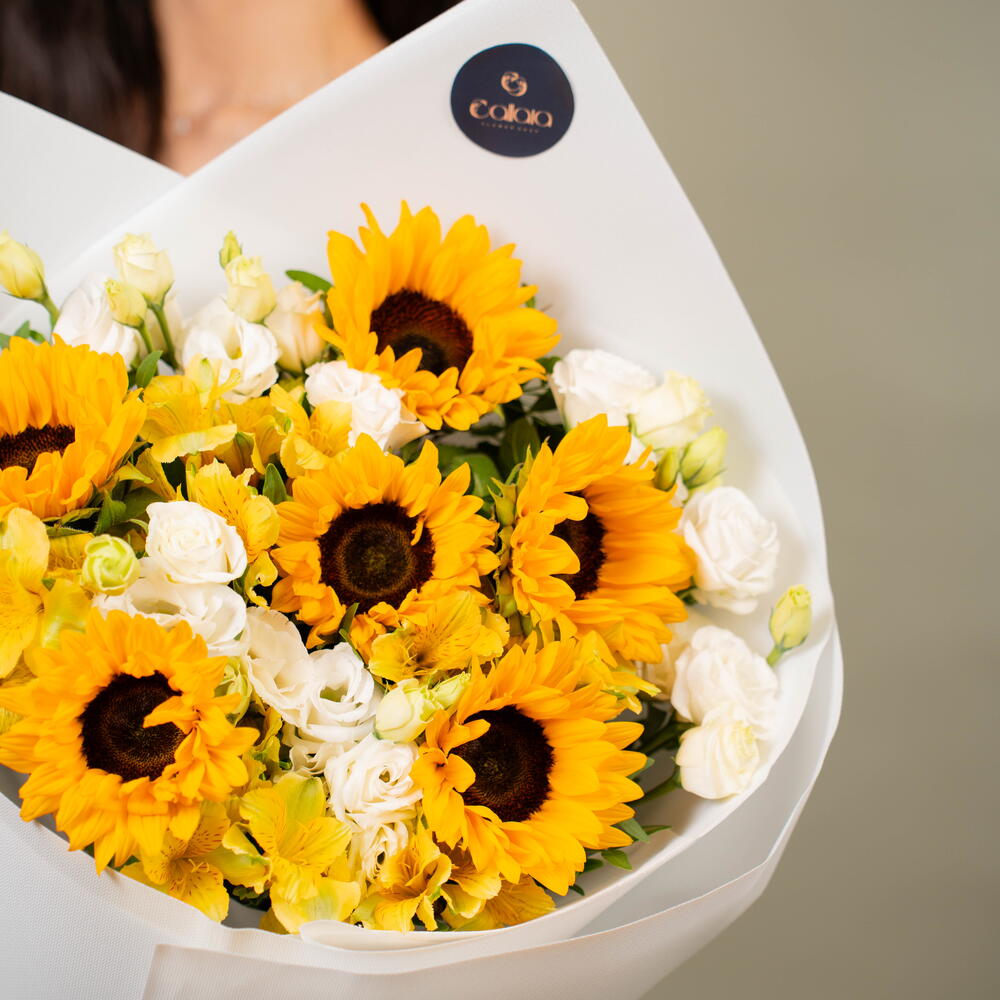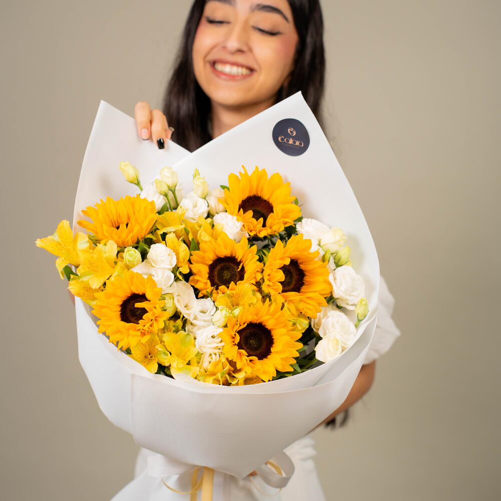 Sunflower - 6 ud. Eustoma white - 5 ud. alstroemeria amarilla - 5 ud.
