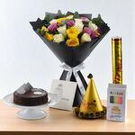 Radiant Rhapsody Paquete de cumpleaños – Ramo de rosas multicolor con pastel Kit de fiesta