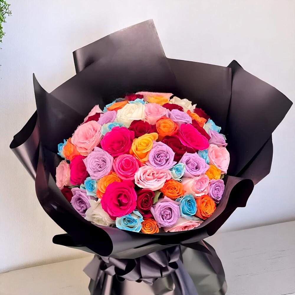 Rainbow Rose Symphony es una explosión de color y alegría, perfecta para celebrar los momentos más vibrantes de la vida. Este lujoso ramo incluye rosas en todo un espectro de tonos —desde rojos apasionados y rosas juguetonas hasta blancos elegantes, lavandas de ensueño, naranjas soleadas y azules llamativos. Envuelto en papel negro elegante con un lazo de satén, es audaz, hermoso e inolvidable. Ideal para cumpleaños, graduaciones o simplemente para hacer sonreír a alguien