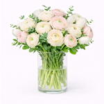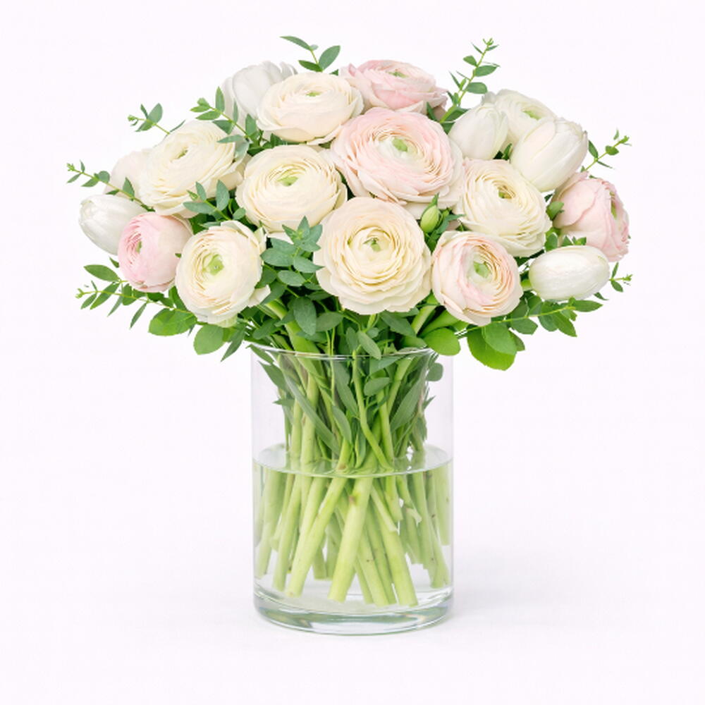5 ranúnculos blancos 5 ranúnculos crema 10 tulipanes rosas 4 hojas parvifolia Preparado en un jarrón de vidrio Acabado con un lazo de cinta