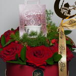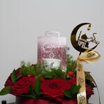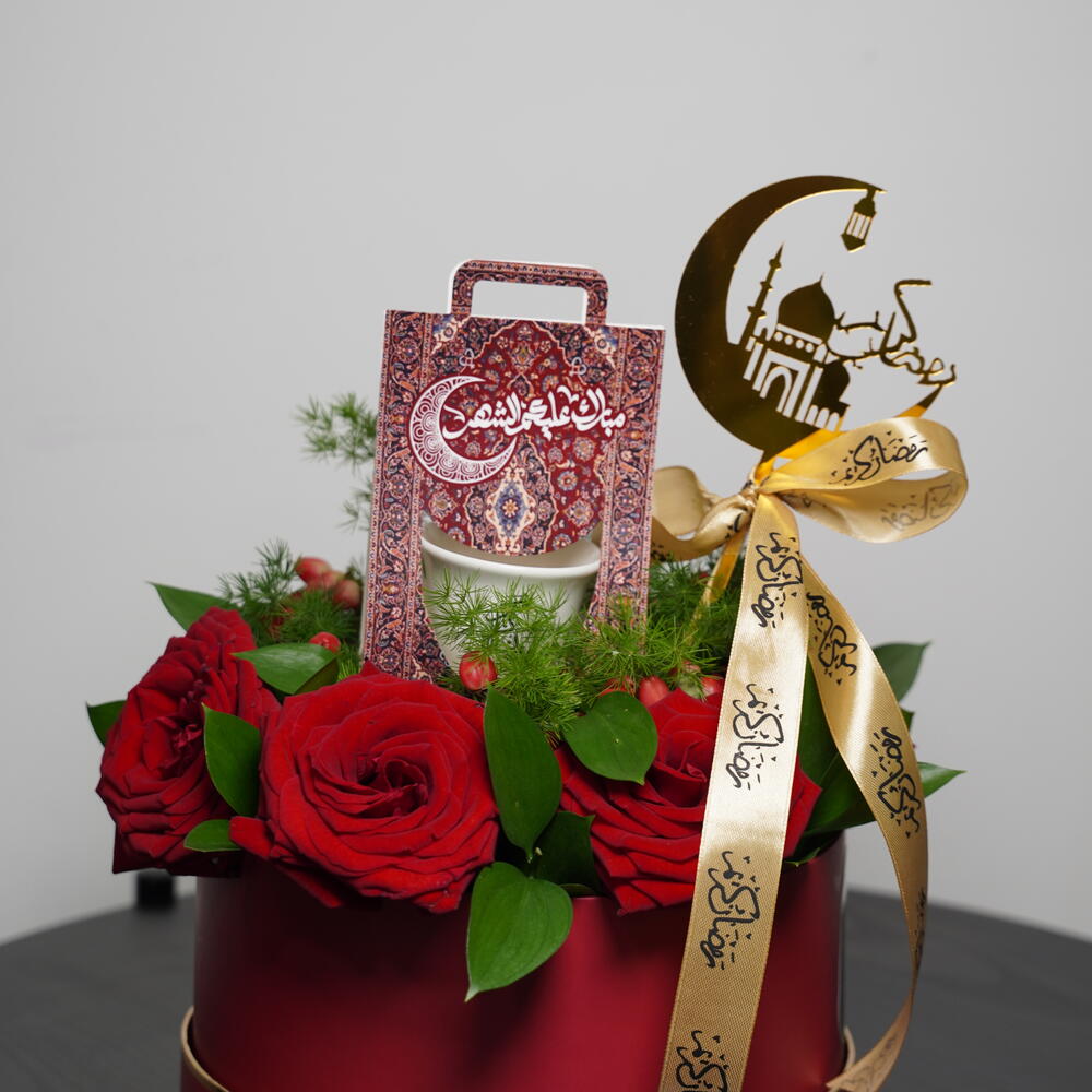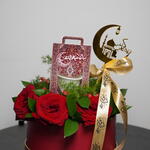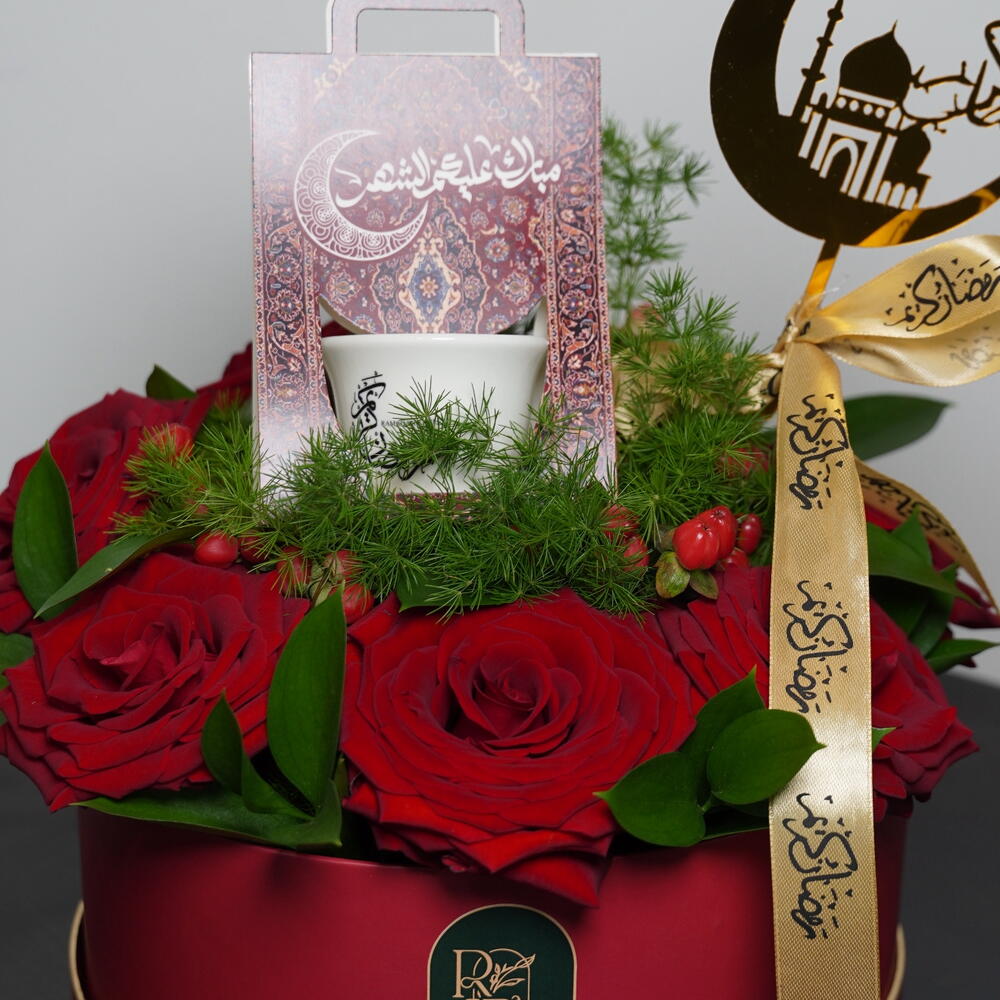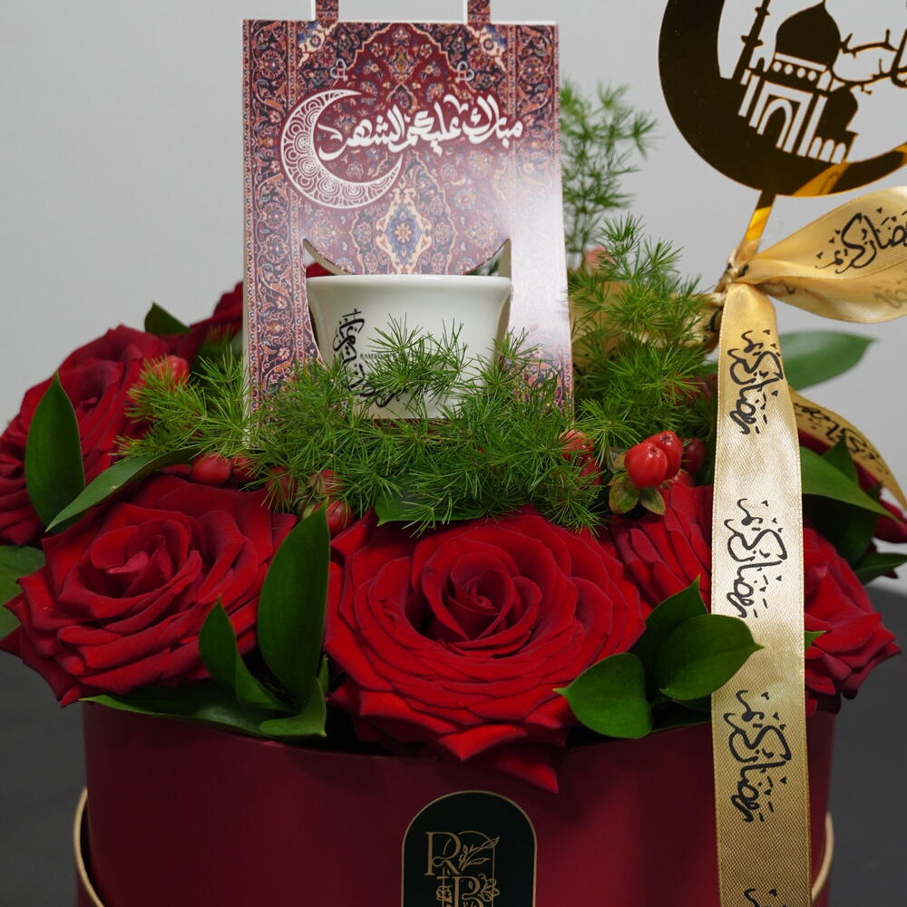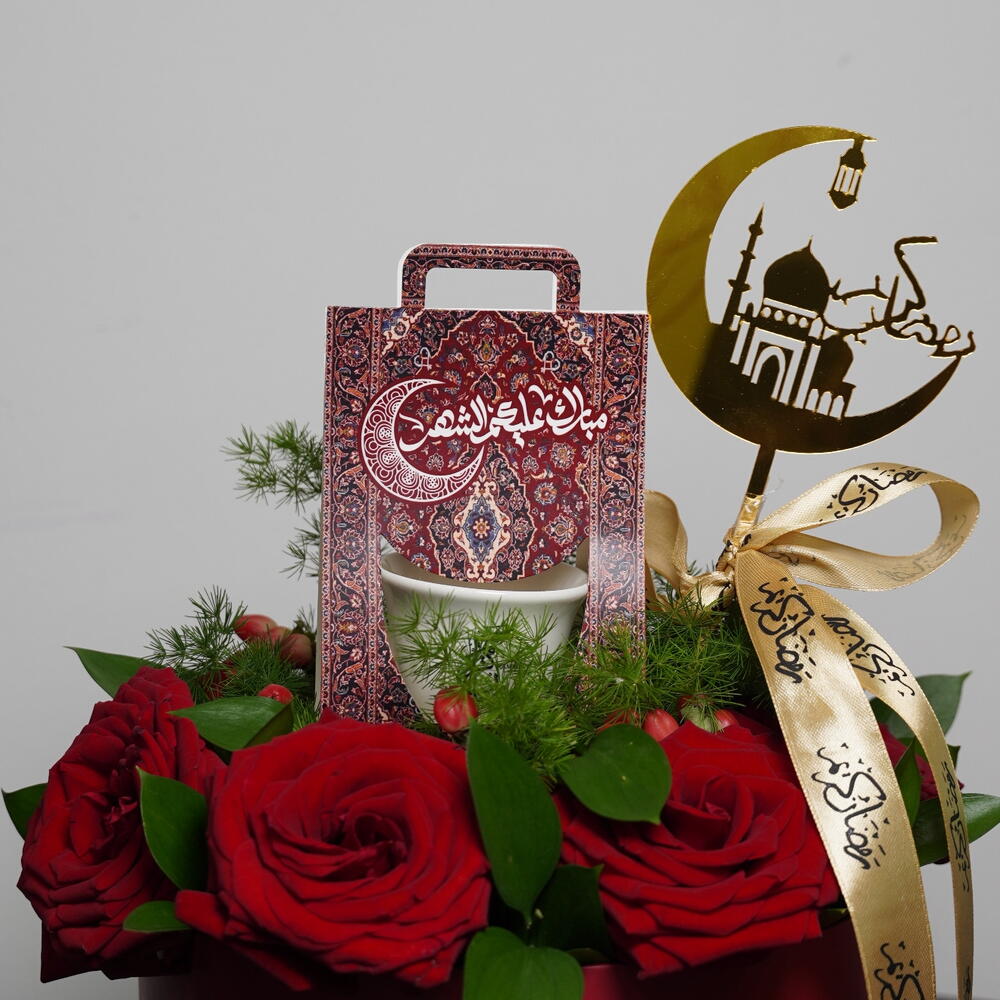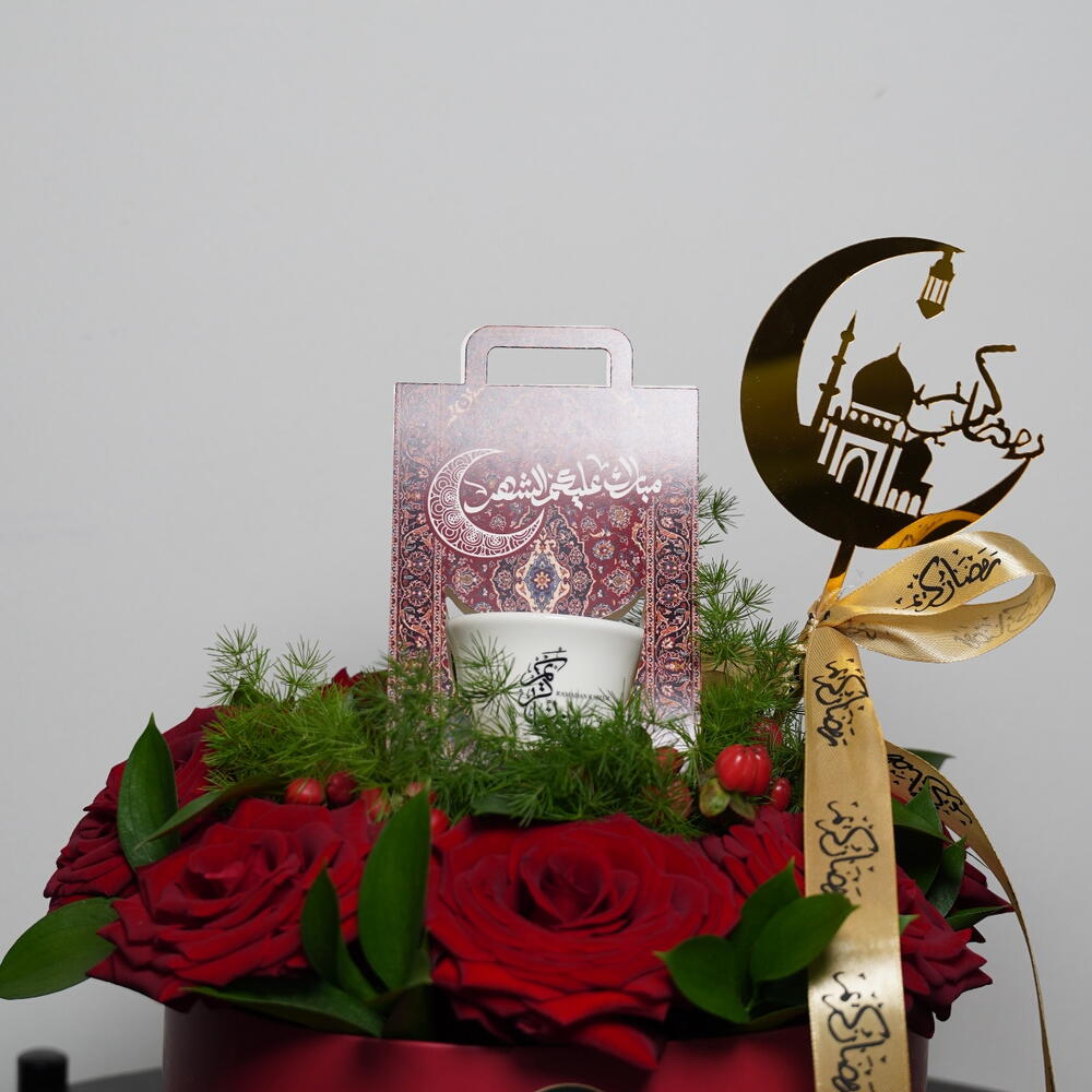 Una opulenta composición de Ramadán diseñada en una lujosa caja de terciopelo rojo, con una exuberante cúpula de rosas rojas de primera calidad que simbolizan el amor, la calidez y la generosidad. Acentuada con follaje fresco y bayas rojas festivas, la composición enmarca bellamente un set de regalo tradicional de Ramadán en el centro. Incluye una elegante taza de café árabe y un paquete decorativo con temática de Ramadán, complementado por un adorno dorado con media luna y una mezquita. Rematada con una lujosa cinta estampada con motivos de Ramadán y tu marca distintiva, esta pieza es perfecta para organizar el Iftar, para regalos con cariño y para obsequios corporativos sofisticados durante el mes sagrado.