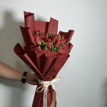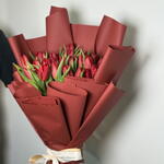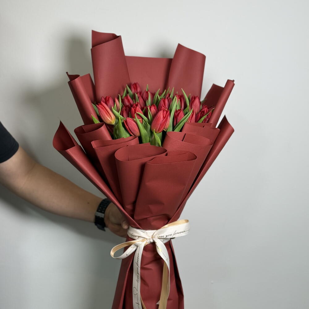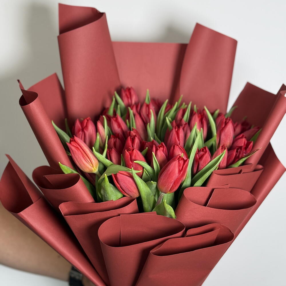 Un llamativo ramo de tulipanes rojos frescos, bellamente envuelto en un elegante papel plegado de un rojo intenso que realza su atractivo audaz y romántico. Los vibrantes tulipanes simbolizan amor profundo y admiración, mientras que el envoltorio en capas añade un toque moderno y lujoso. Perfecto para expresar sentimientos sinceros, celebrar momentos especiales o sorprender a alguien con un gesto de amor atemporal. 💐✨