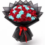 Un exquisito ramo de rosas rojo intenso y azul cielo envuelto en elegantes capas negras, perfecto para hacer una declaración audaz e inolvidable. Una armoniosa mezcla de pasión y serenidad, ideal para ocasiones especiales o gestos sinceros.