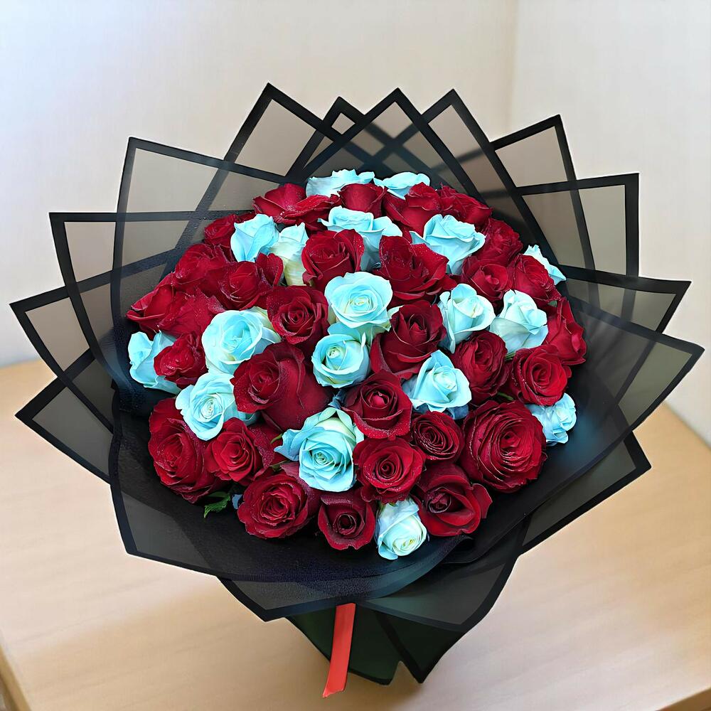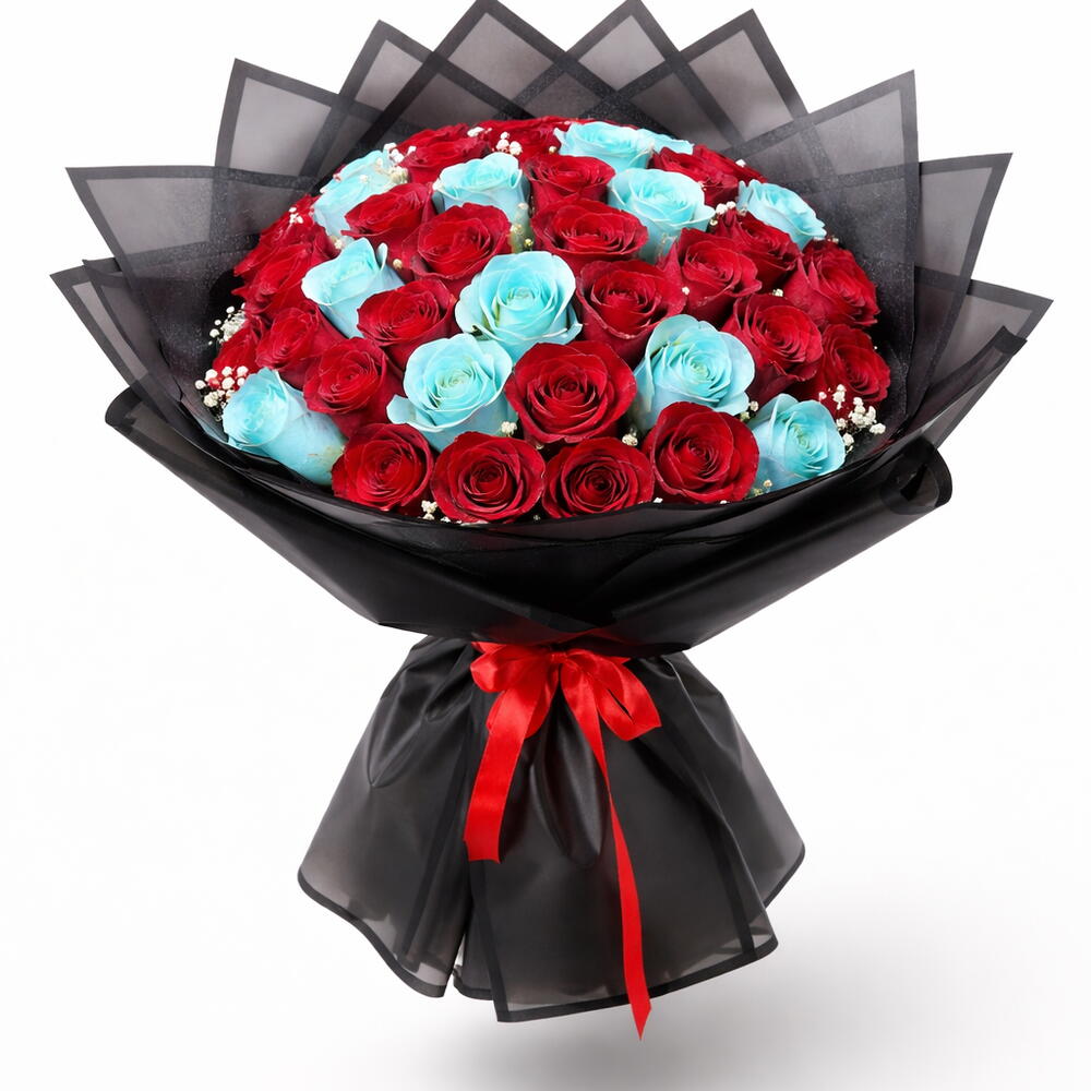 Un exquisito ramo de rosas rojo intenso y azul cielo envuelto en elegantes capas negras, perfecto para hacer una declaración audaz e inolvidable. Una armoniosa mezcla de pasión y serenidad, ideal para ocasiones especiales o gestos sinceros.