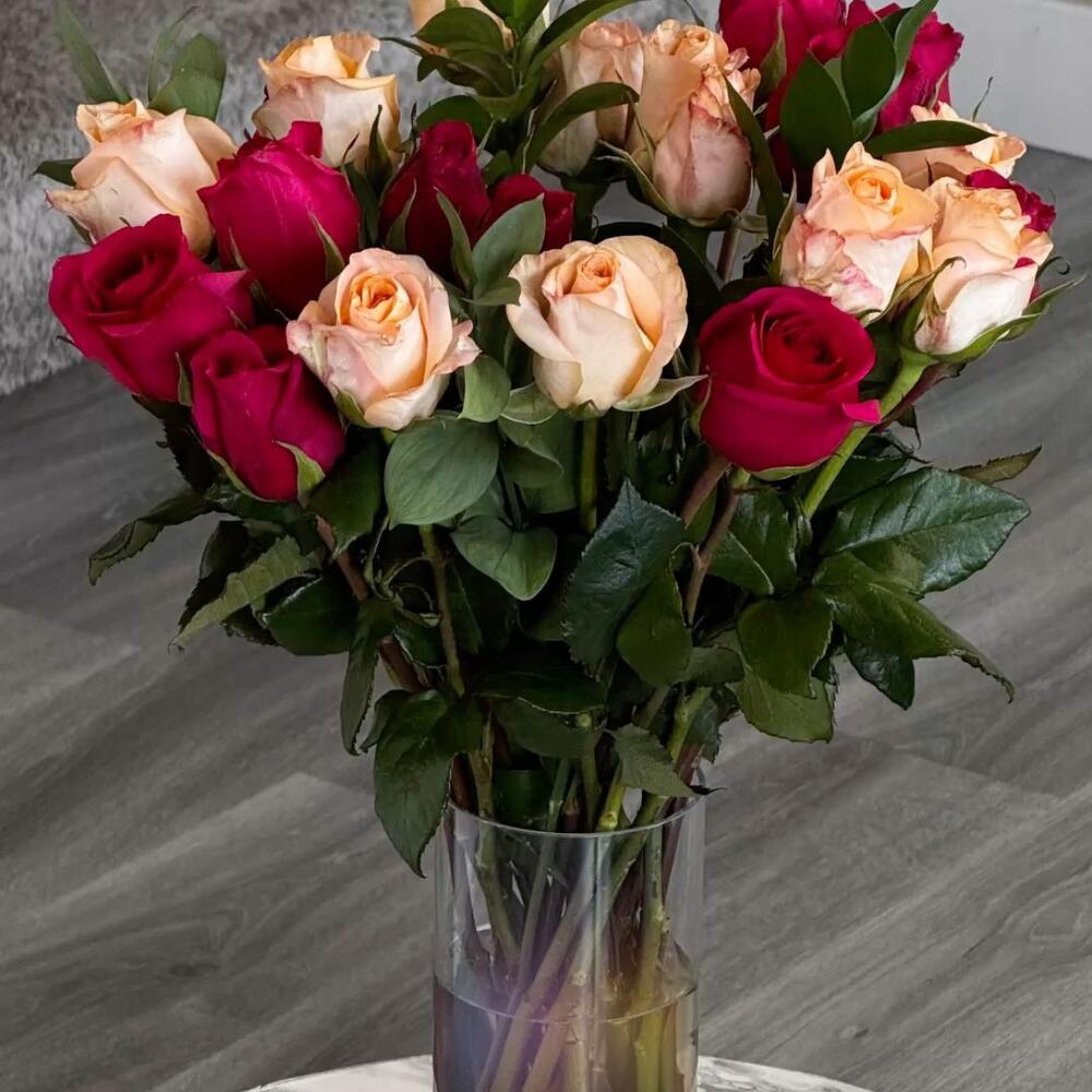Red rose - 10 ud. rosa melocotón - 9 ud. jarrón de vidrio 12 x 25 - 1 ud.