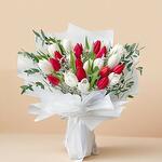 Des - Hermoso ramo de 11 tulipanes rojos y 11 blancos decorado con rellenos verdes.
