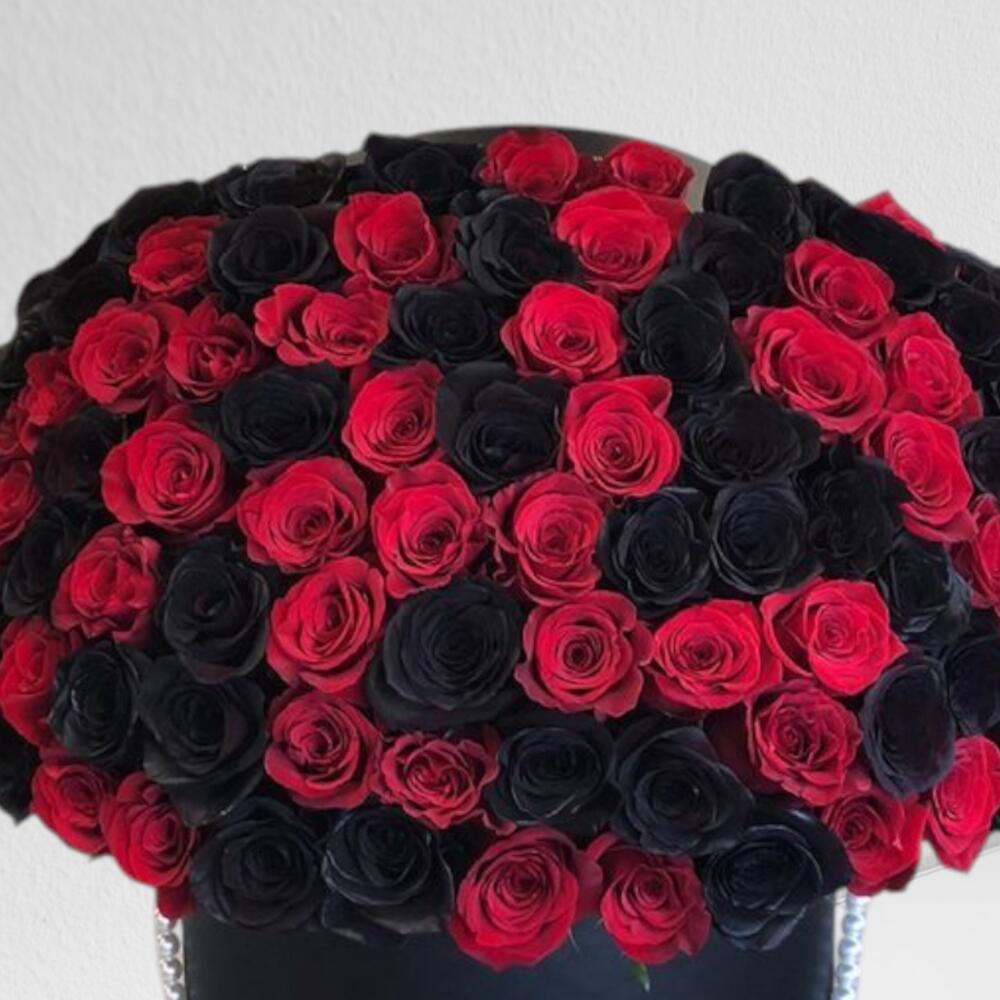 Sumérgete en el cautivador encanto de este opulento arreglo floral, magistralmente curado con 51 rosas rojas vibrantes combinadas a la perfección con 50 rosas negras místicas, ambas rociadas con un delicado spray negro para mayor encanto. Presentada cuidadosamente en una única caja negra, esta cesta floral seguramente cautivará corazones y creará recuerdos duraderos.