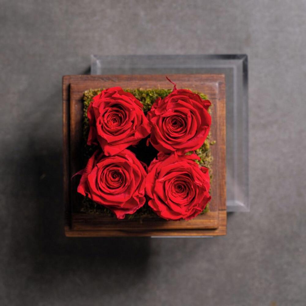 Red Infinity Quatro es una exquisita composición floral que consta de cuatro elegantes rosas rojas Infinity alojadas en una caja de madera de alta calidad y adornada con follaje decorativo.