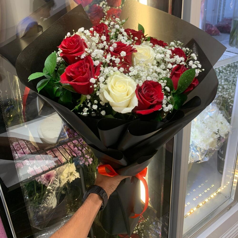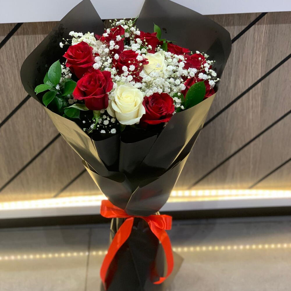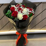 Red rose - 9 ud. Ruscus - 3 ud. White rose - 3 ud. yeso - 3 ud.
