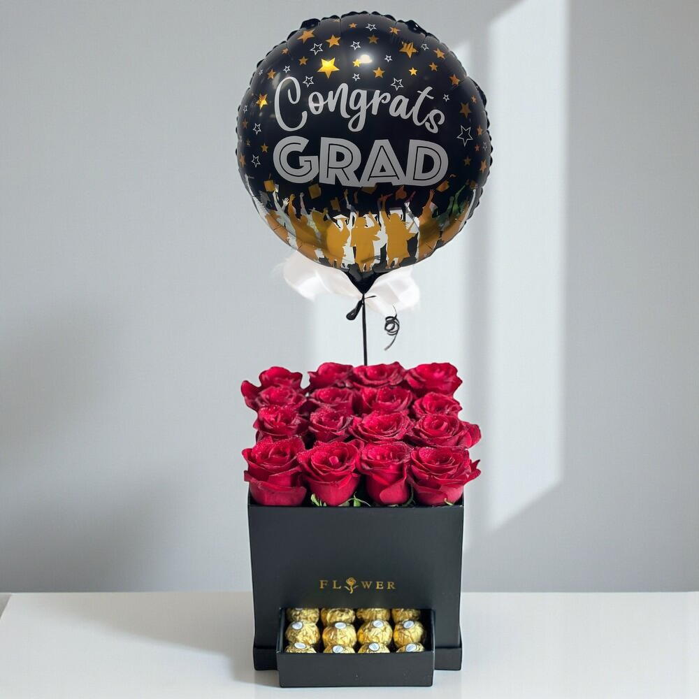 Red rose - 16 ud. Box - 1 ud. chocolate ferrero rocher - 16 ud. globo metalizado «¡felicidades, graduado!» - 1 ud.